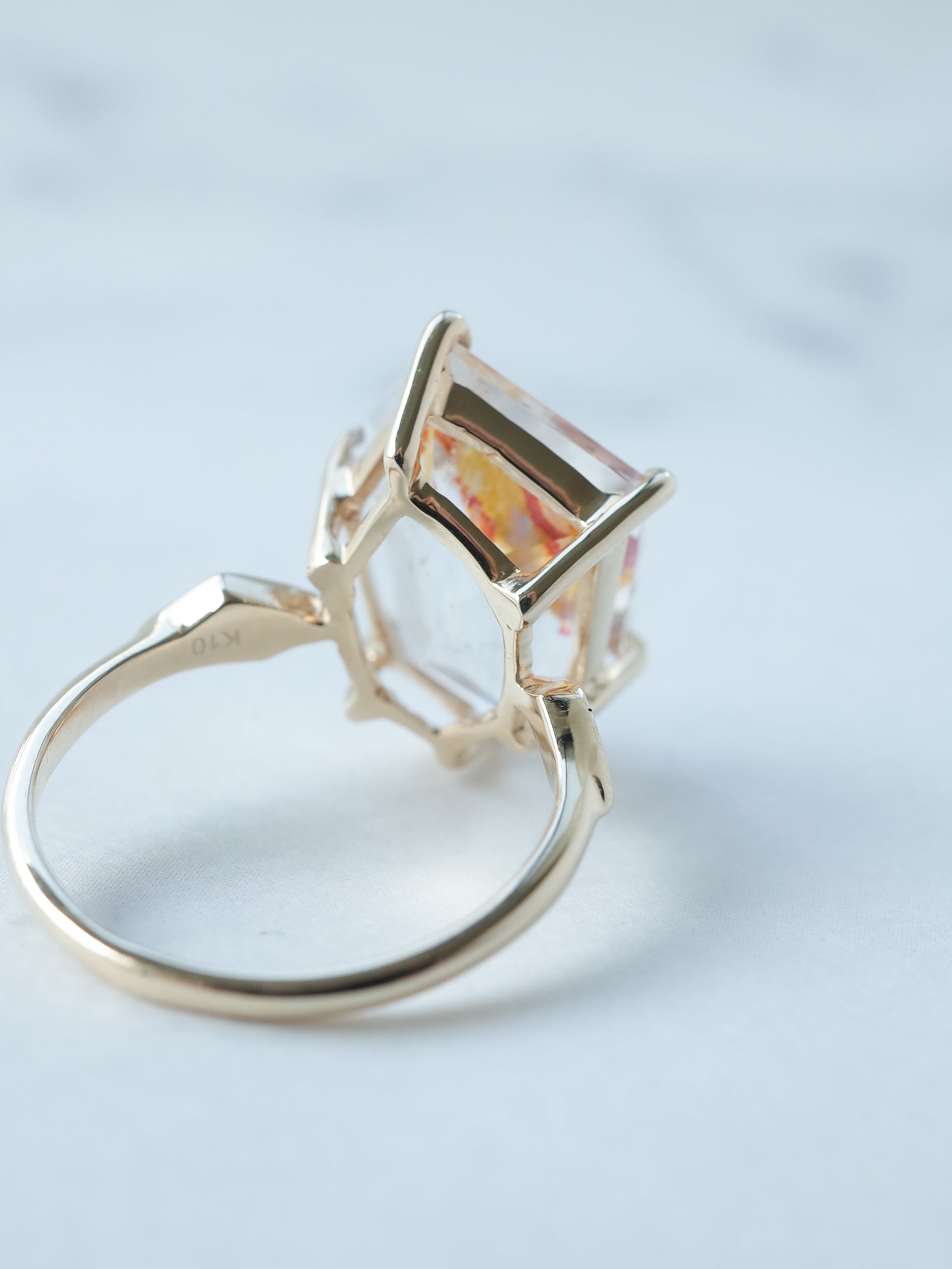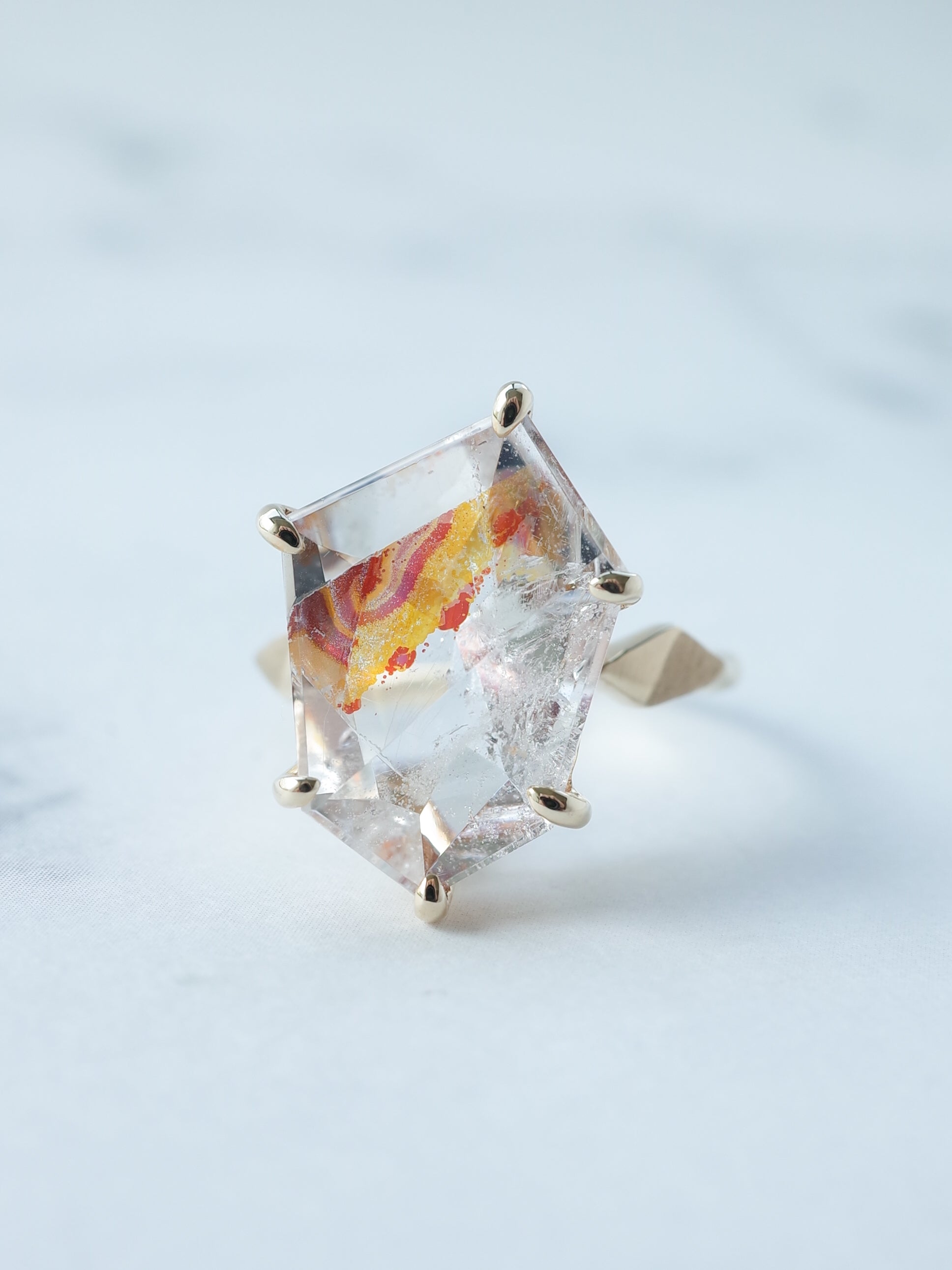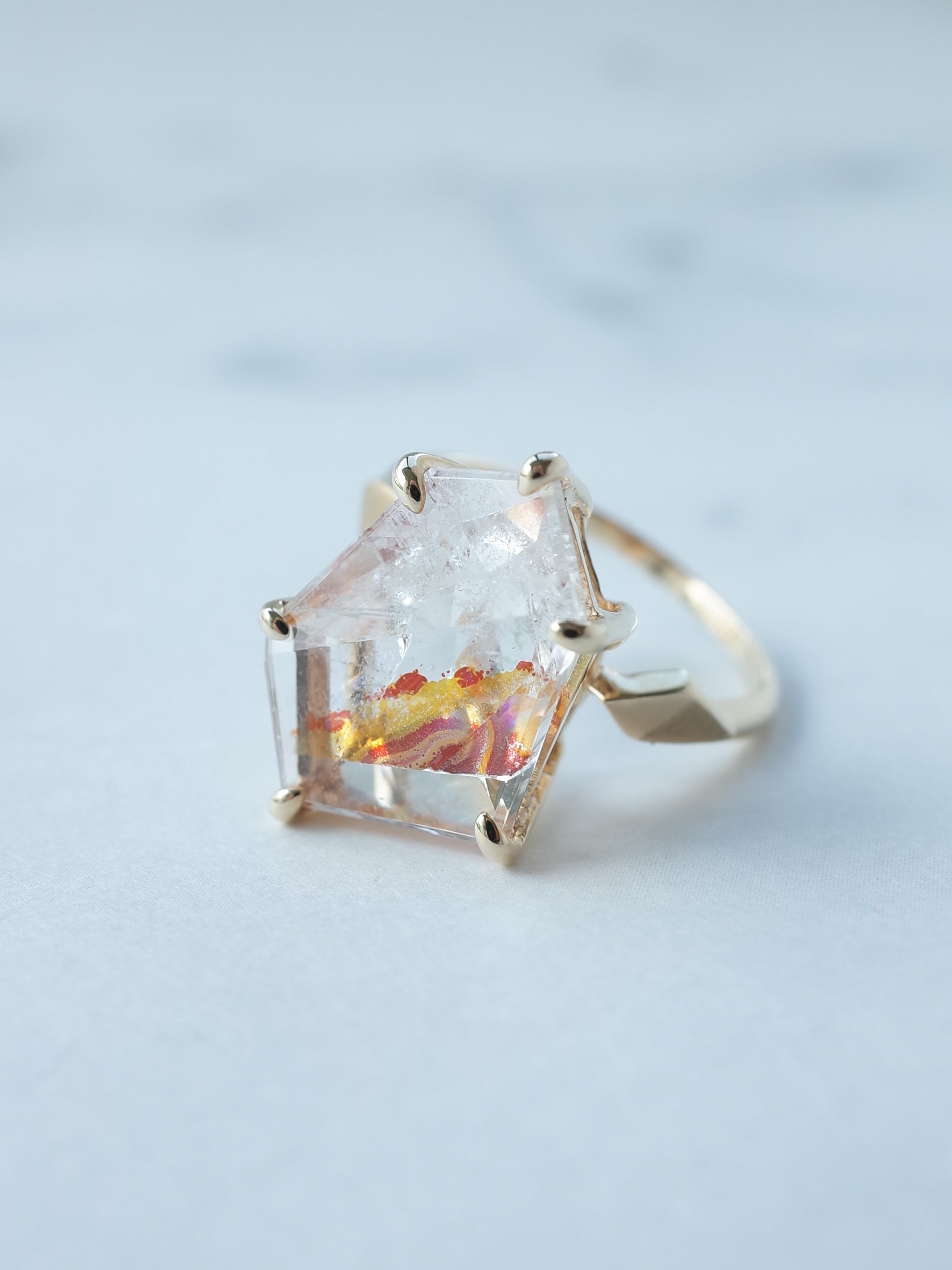 クリアな水晶の中に、差し色のように入る赤と黄色が魅力的なオーロラクォーツは、赤い部分がヘマタイト、黄色い部分がリモナイトというインクルージョンです。表面のカットを敢えて大きく2面のみでとっているのが新鮮な印象です。