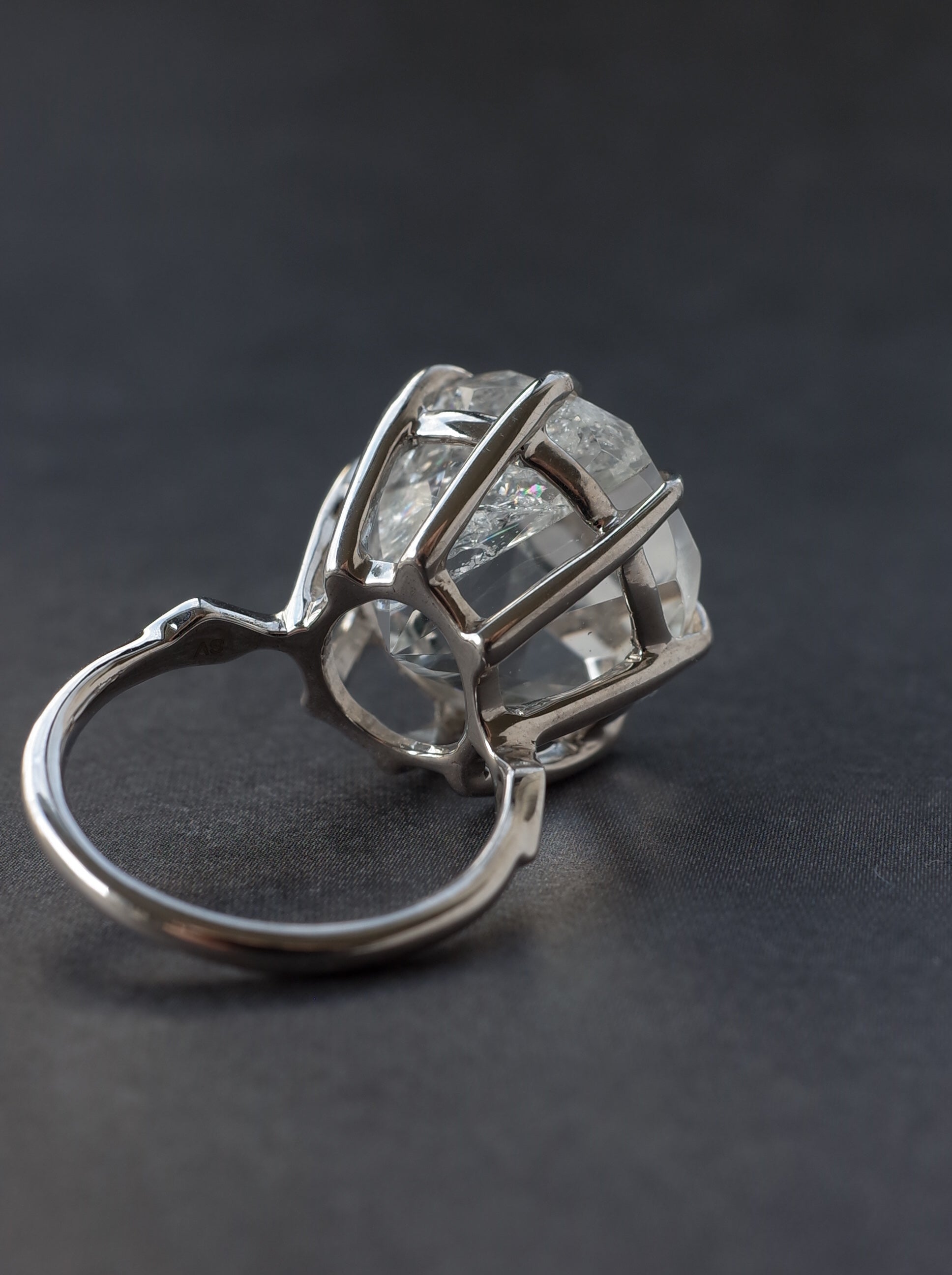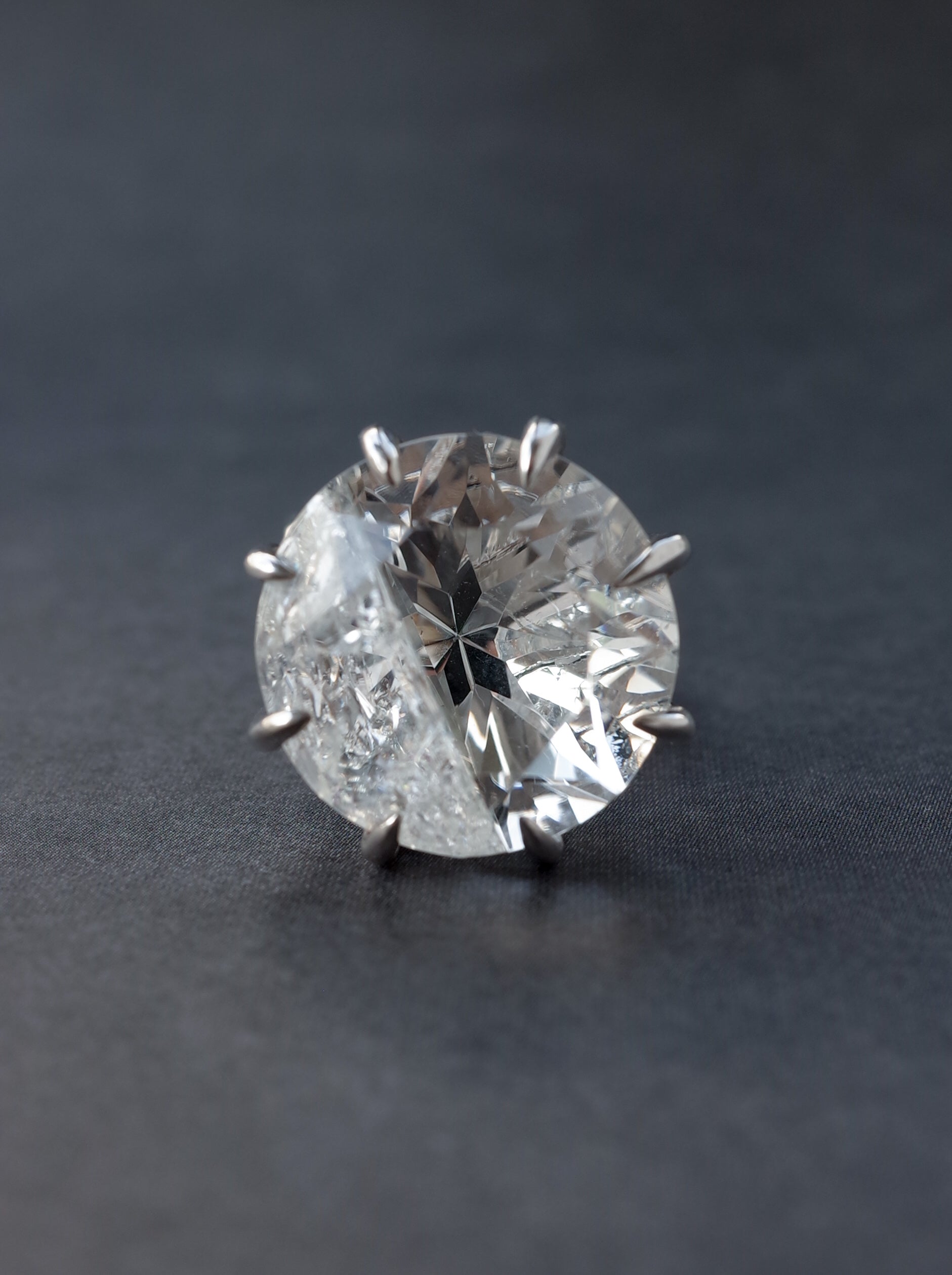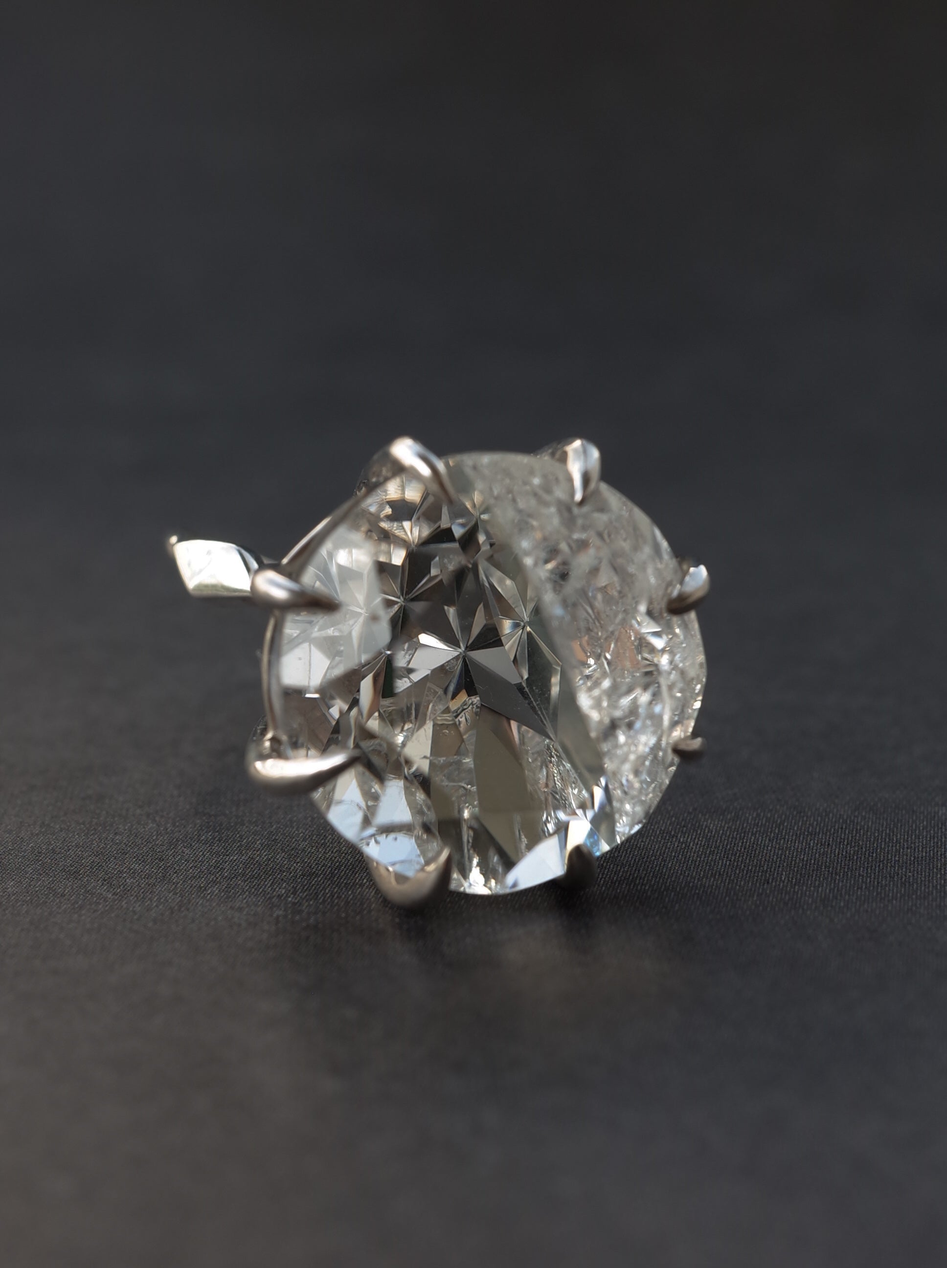 こちらはシンセティッククォーツを用いて、人為的にクラッシュ (ひび割れ )を作り、それを貼り合わせて再度研磨するという工程を経て作られた彼女のアート作品です。天然でもこのようなクラッシュは存在しますが、はっきりと直線で分かれるようなことなく、人工的であり天然的でもある、その間を行くようなコンテンポラリーな佇まいが唯一無二の存在感を放っています。