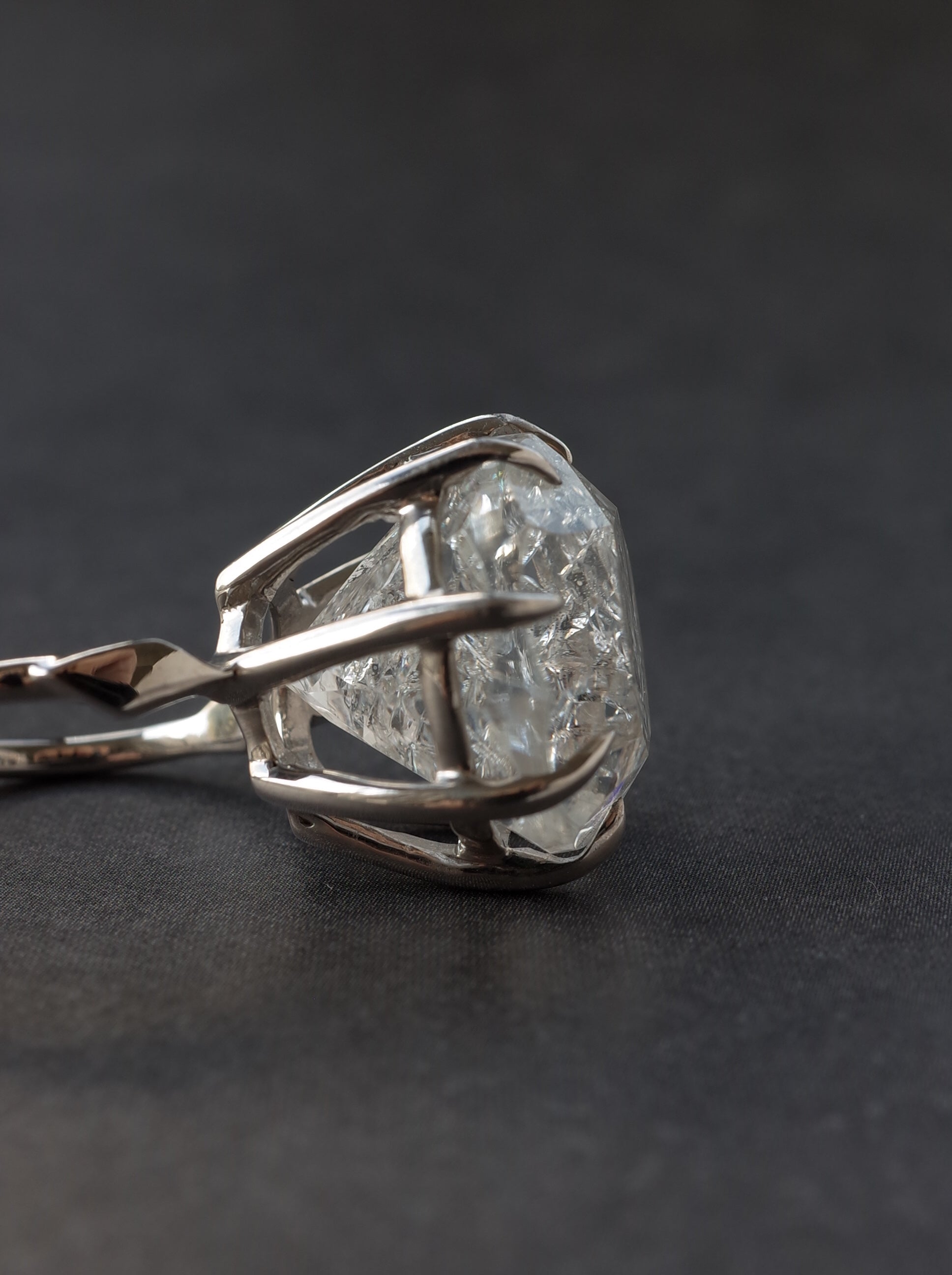 どこまでも透き通ったクォーツと、割れた氷の様なクラッシュのコントラストが美しい、若手研氏大城かん奈さんオリジナルのクラッシュクォーツを使用したリングです。