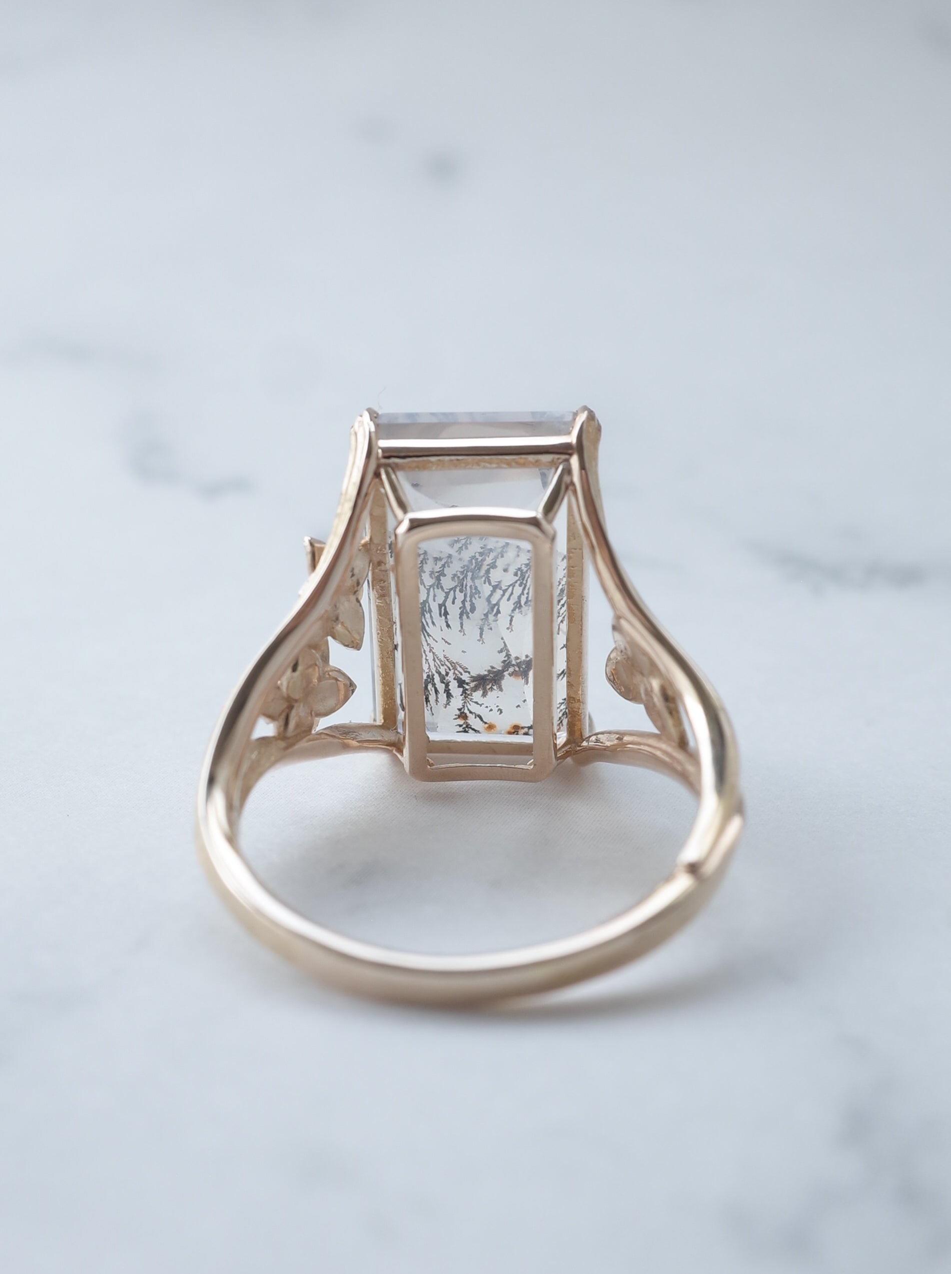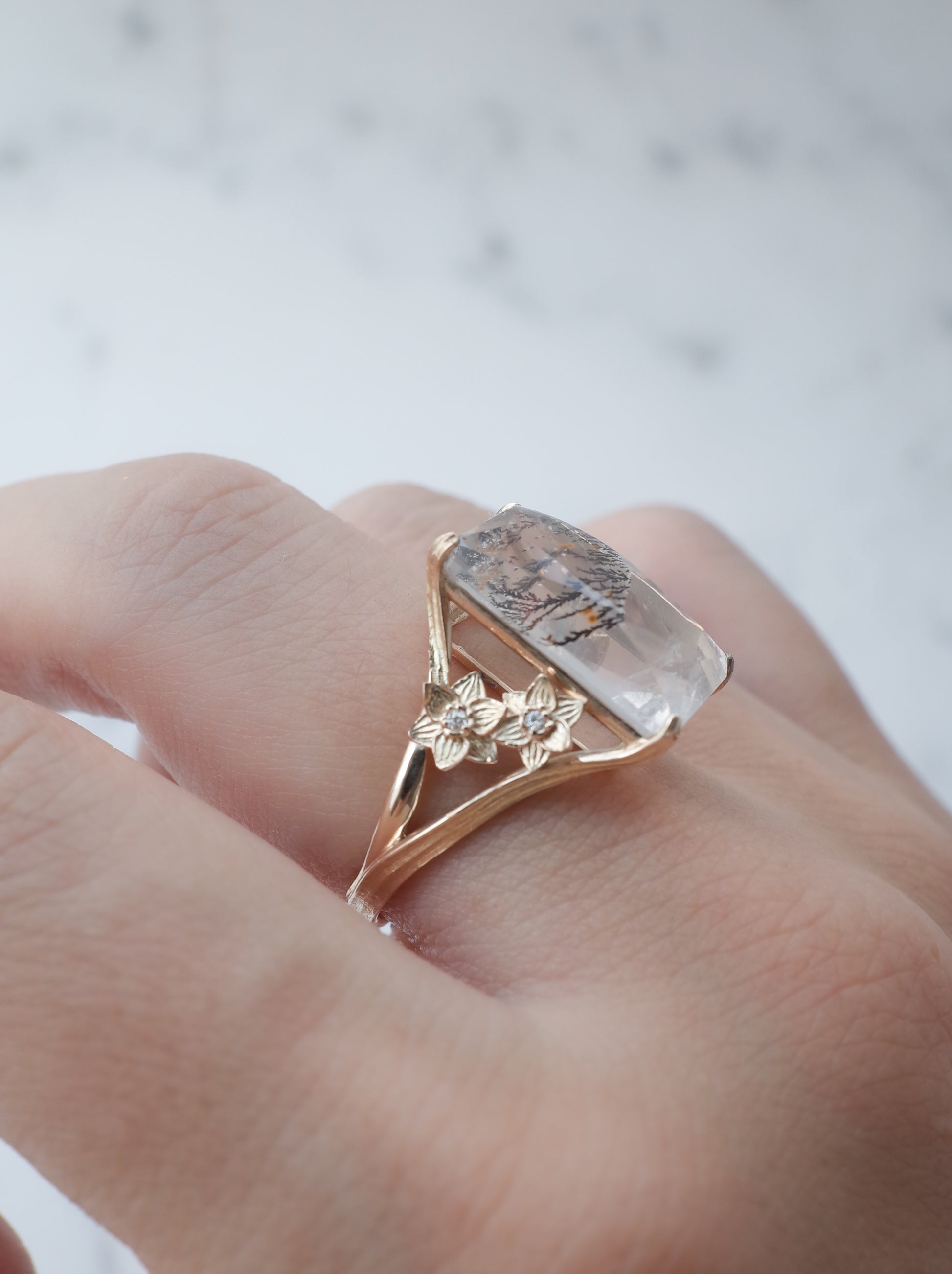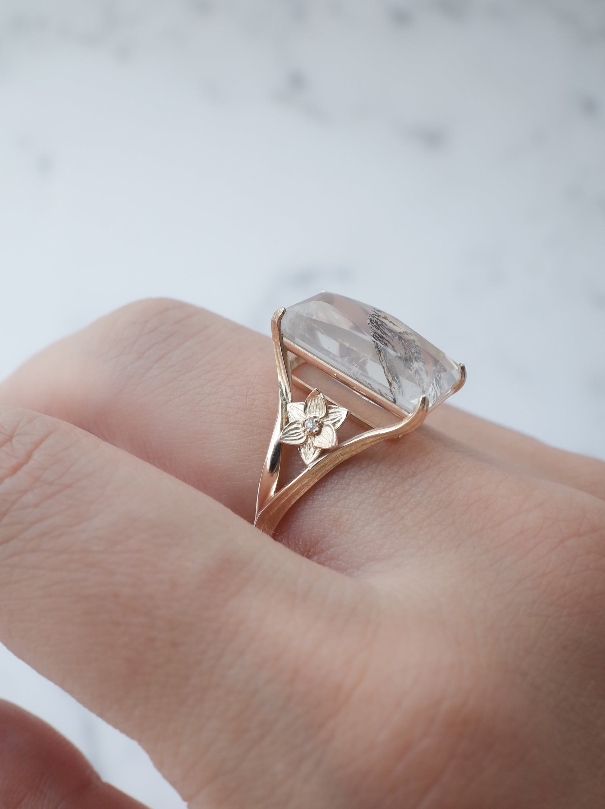 「ダッフォディル」とは水仙のこと。デザイナーが2年ほど暮らしたアイルランドやお隣のイギリス連邦では春を告げる花として知られています。水仙の花のモチーフは全て少しずつサイズや花びらの折れ方に差をつけていて、よりリアルな表情を見せてくれます。全体をぐるっととりまく腕は水仙の葉そのもので、葉先が石をそっと留めているようなイメージで仕上げました。