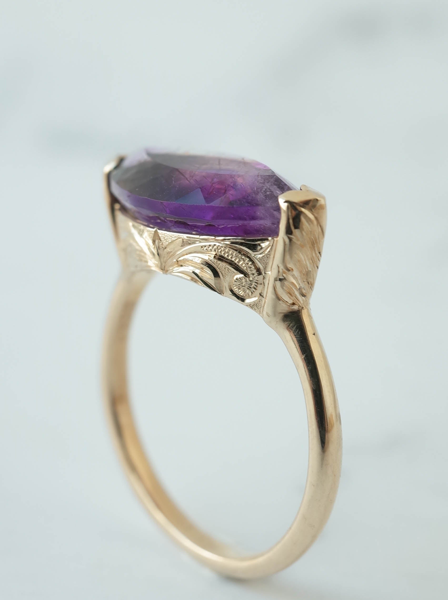 こちらはハワイアンエングレービングを施したデザインのリングで、彫り師、三村紀人さんとのコラボレーションコレクションです。南国には欠かせない蘭の花を思わせるような紫色のアメシストに、マイレリーフとスクロールの模様が大胆に彫られています。