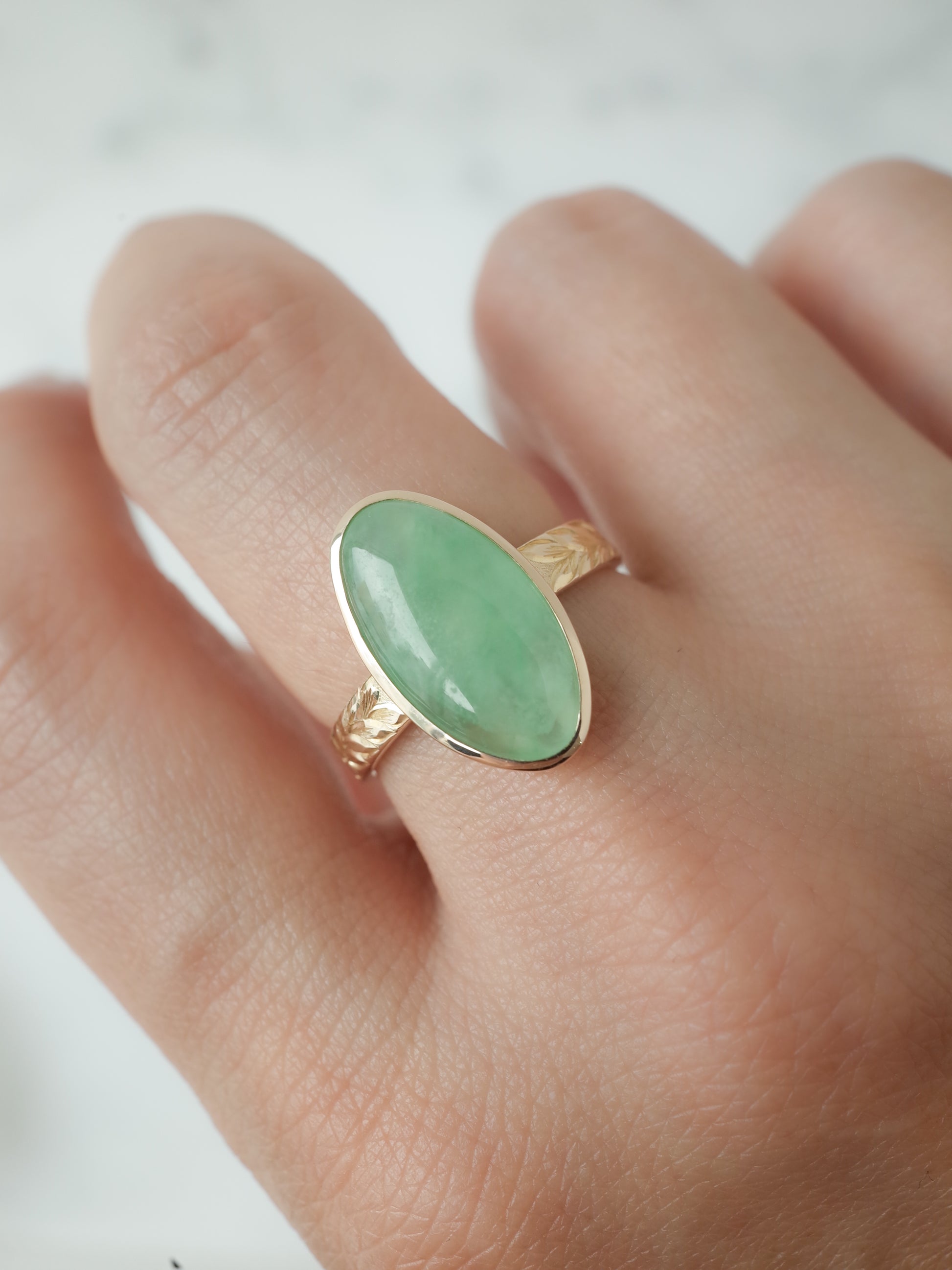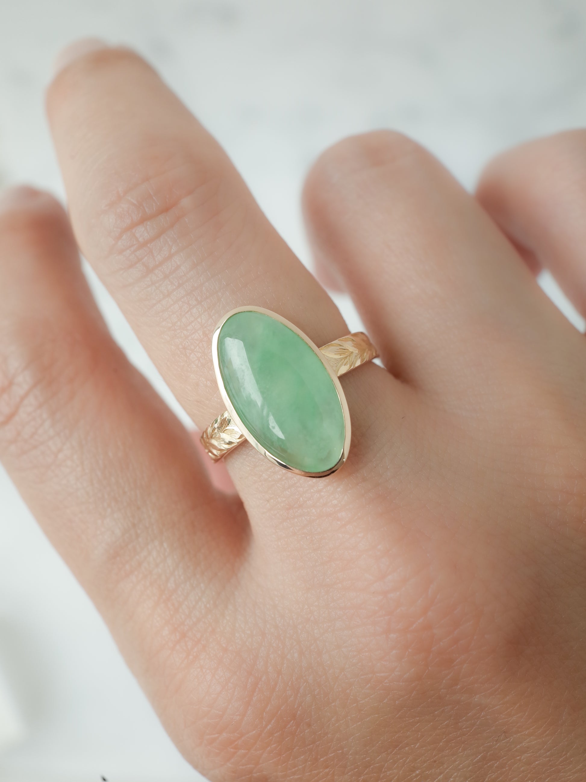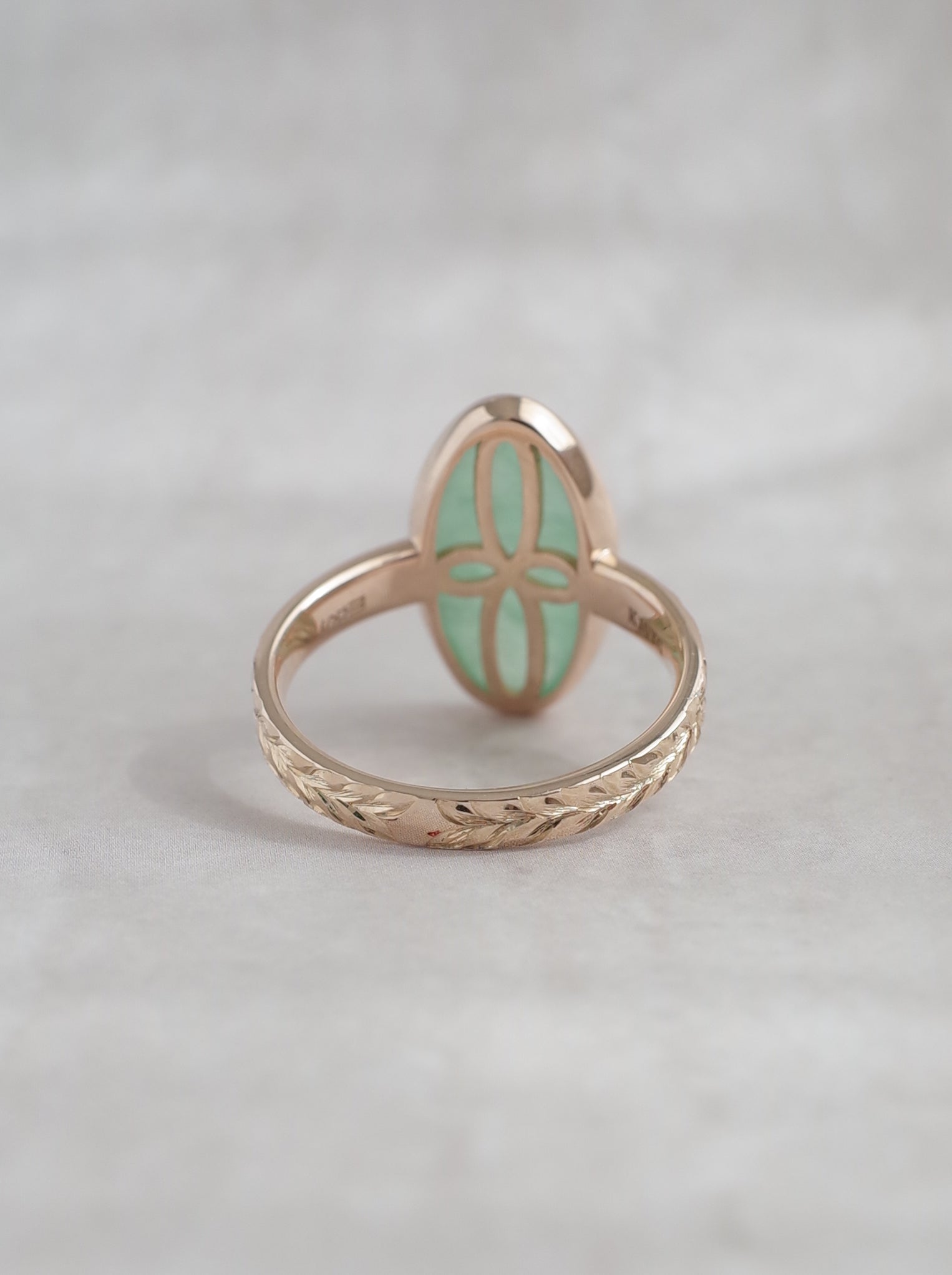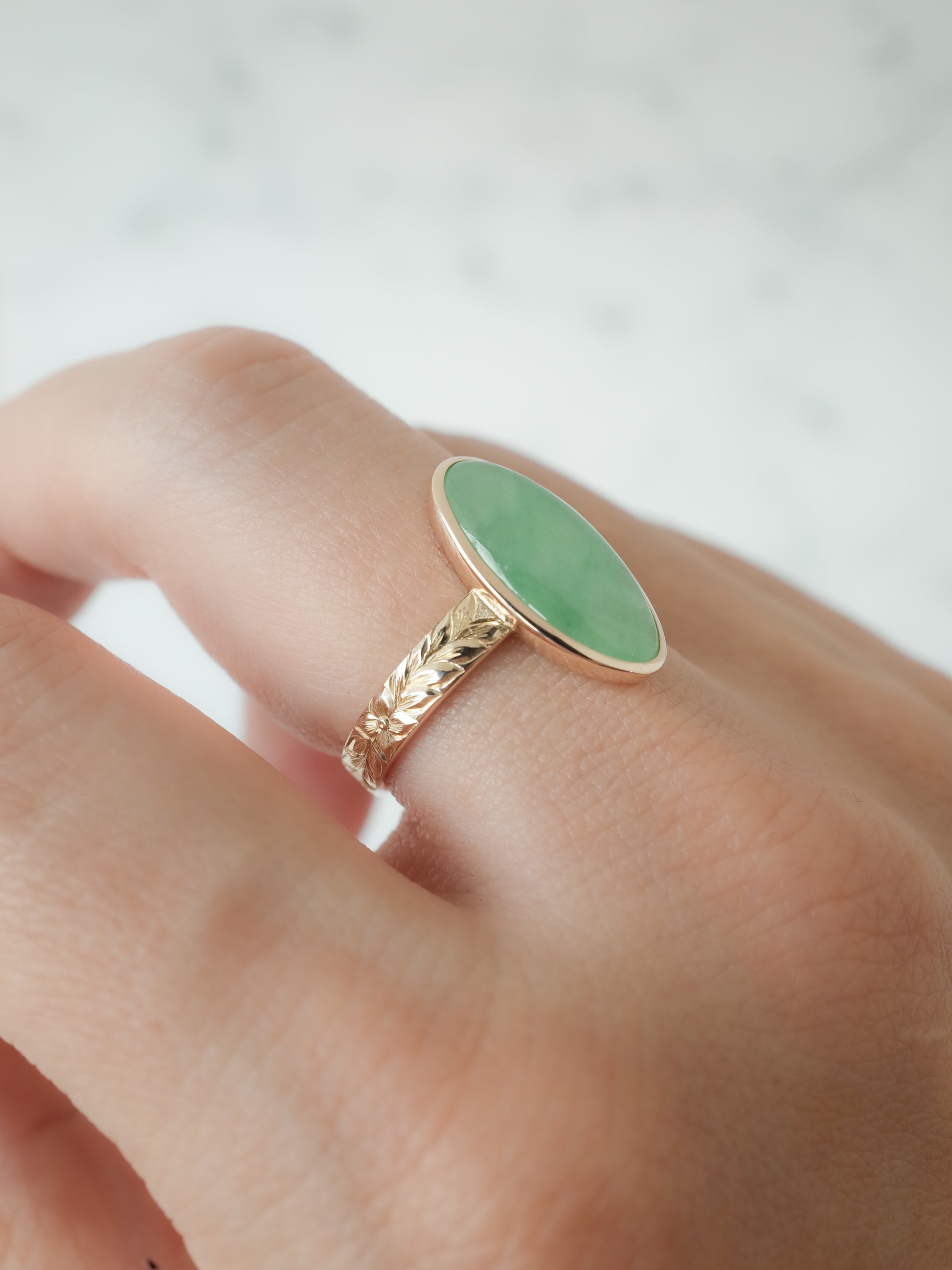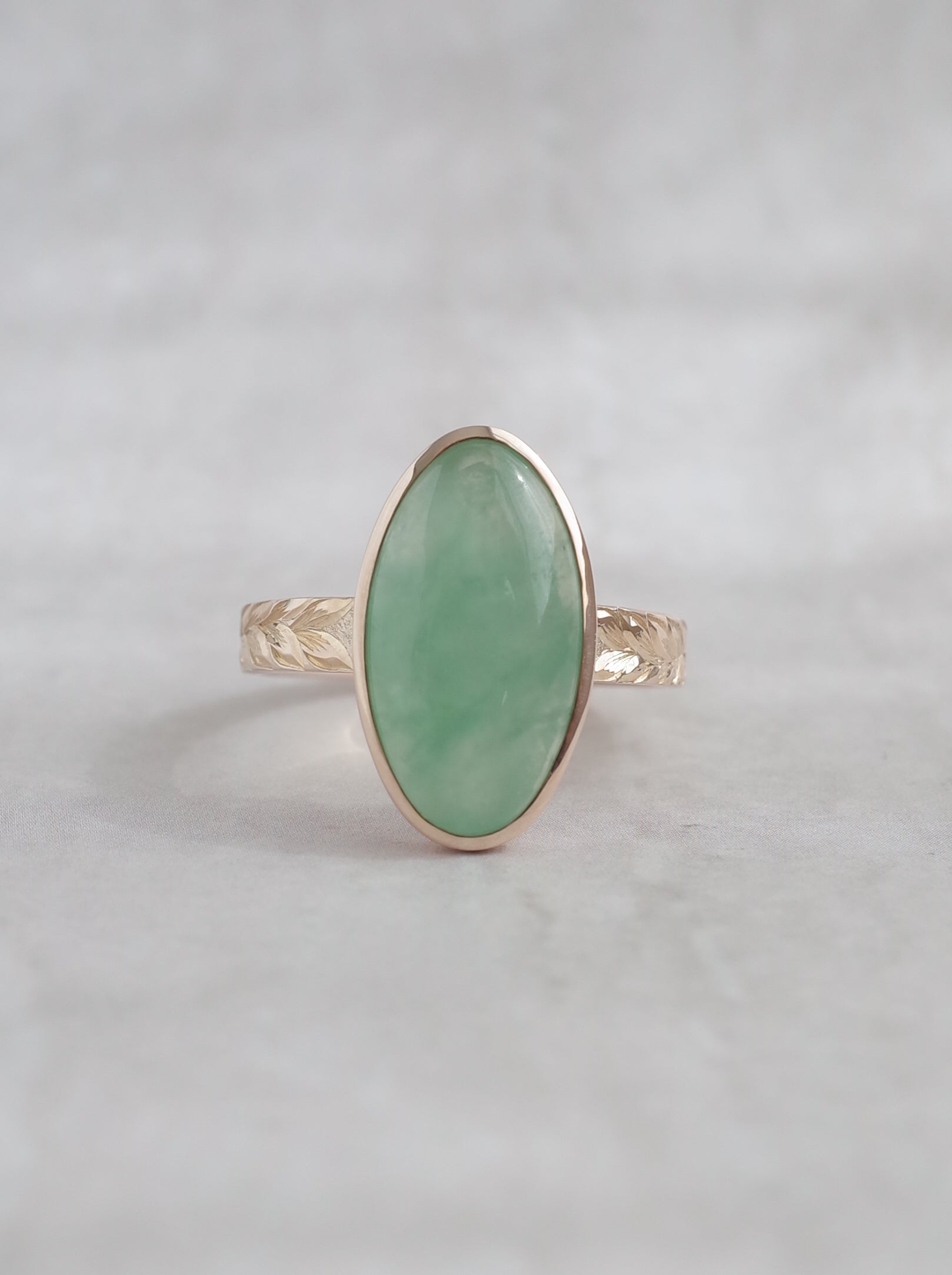 こちらは国産の糸魚川翡翠にハワイアンエングレービングを施したデザインのリングで、彫り師、三村紀人さんとのコラボレーションコレクションです。