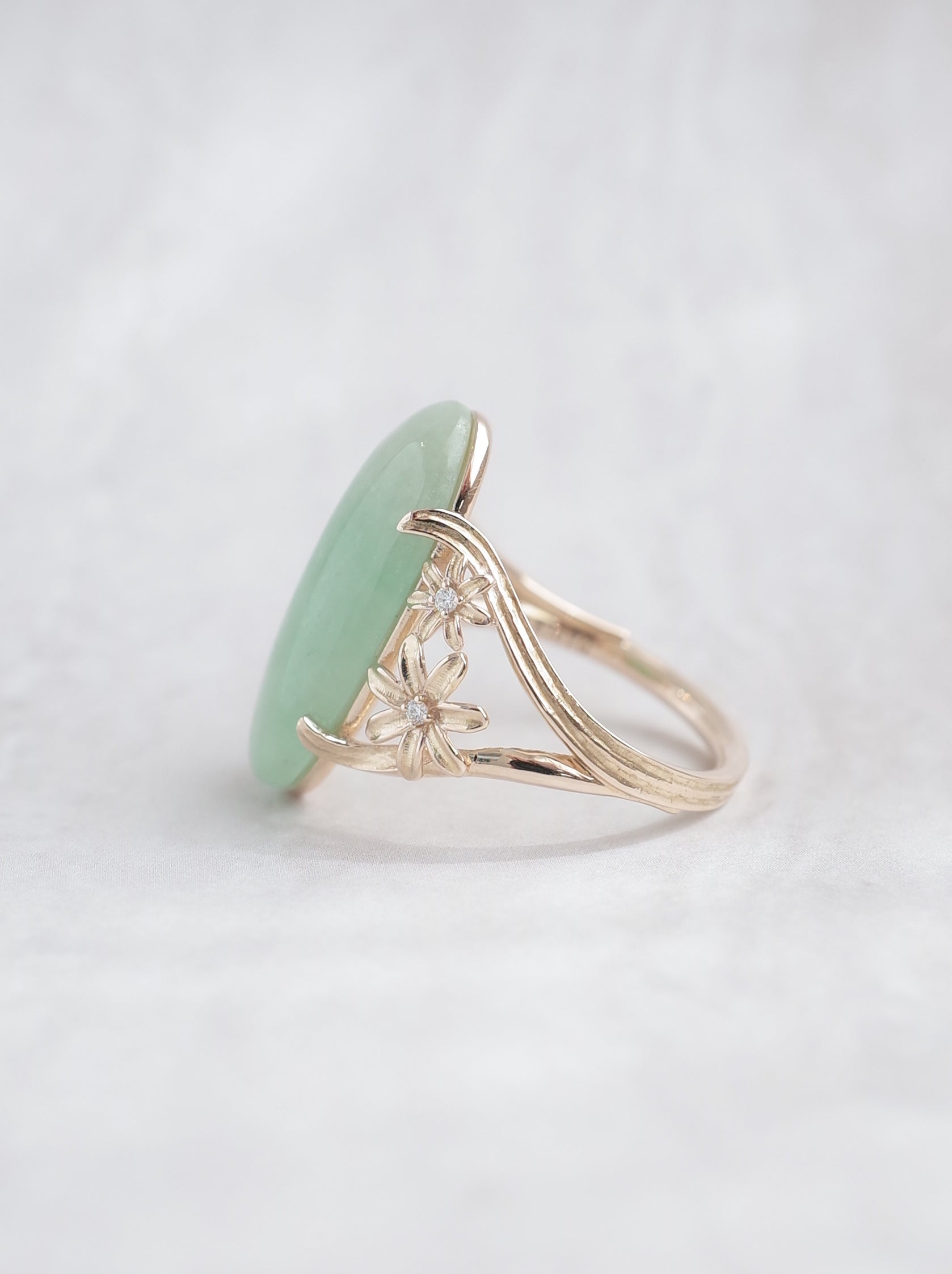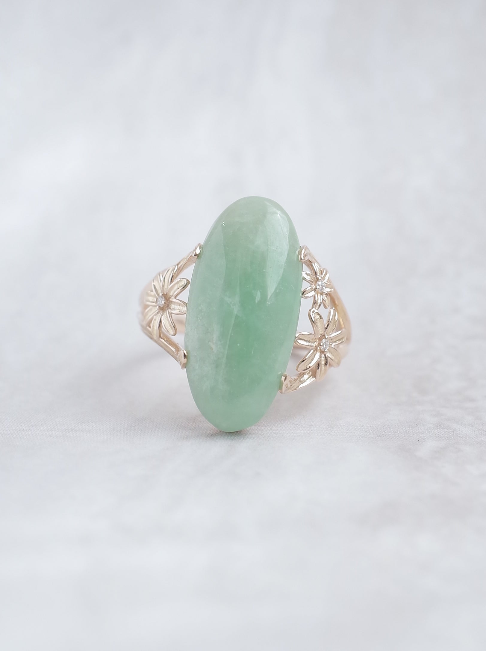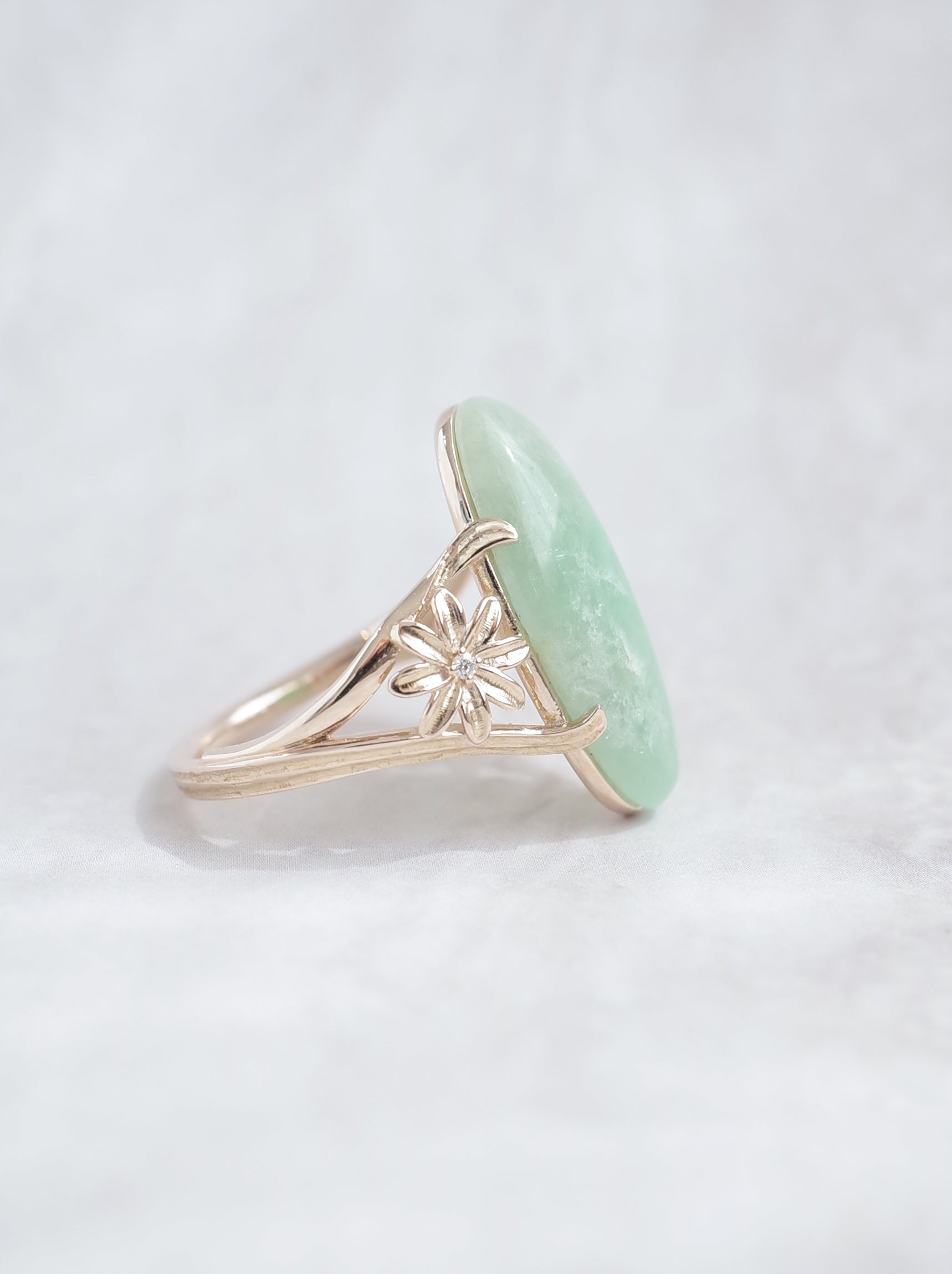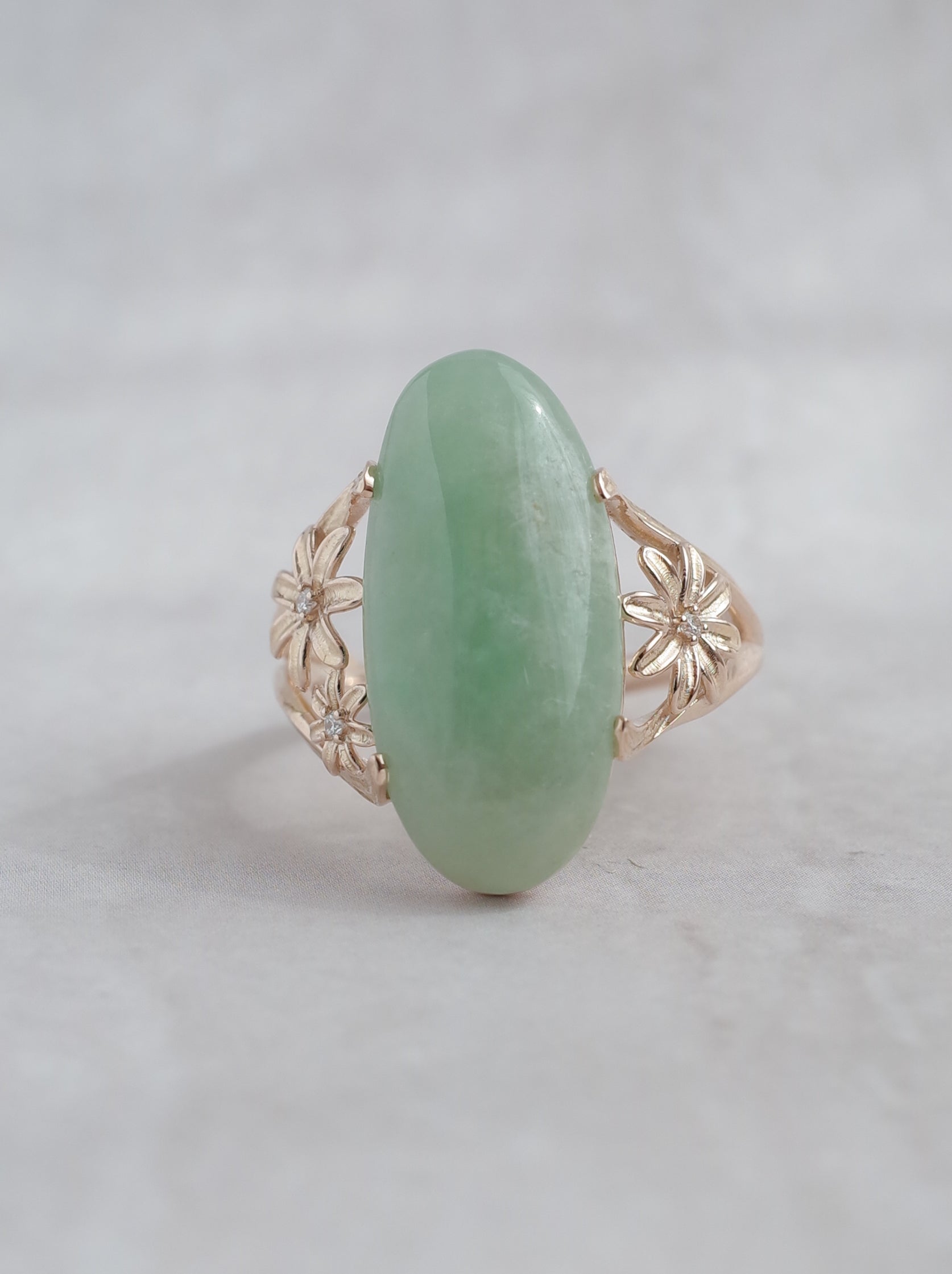 こちらは個性あふれる天然石とハワイアンのテイストを掛け合わせたのコレクション《 oiaio collection 》より、国産の糸魚川翡翠に、ティアレの花とダイヤをあしらったリングです。
