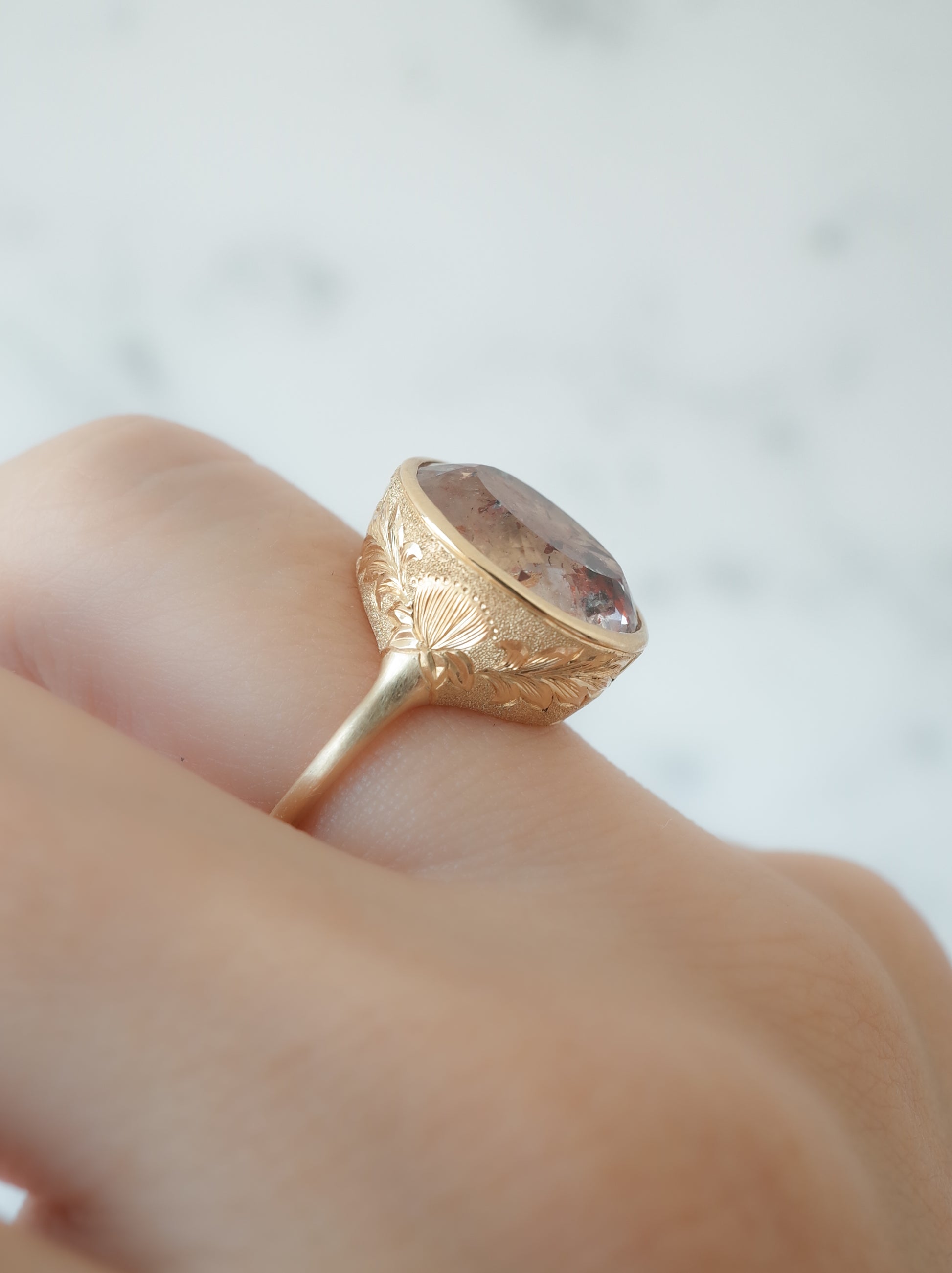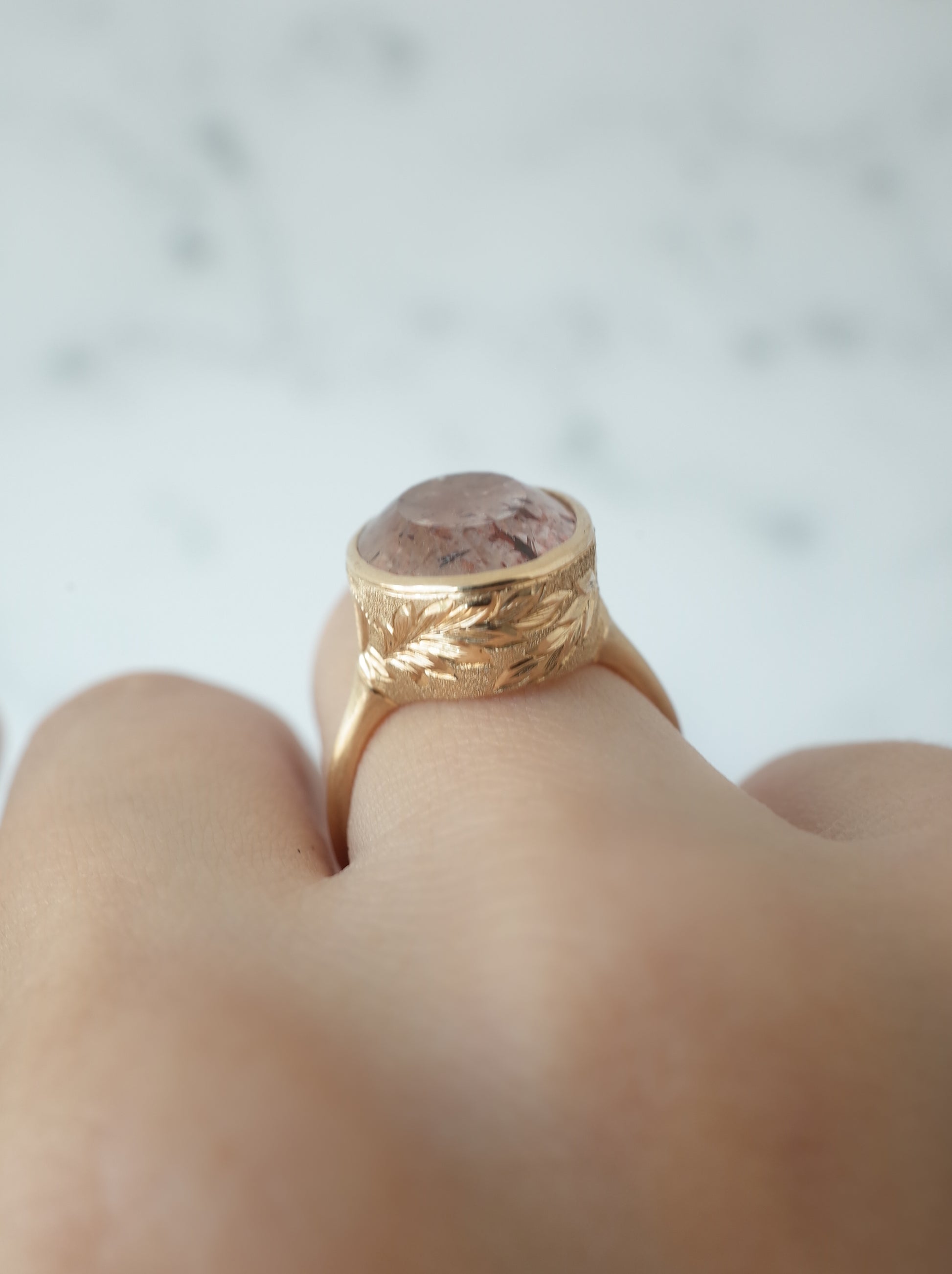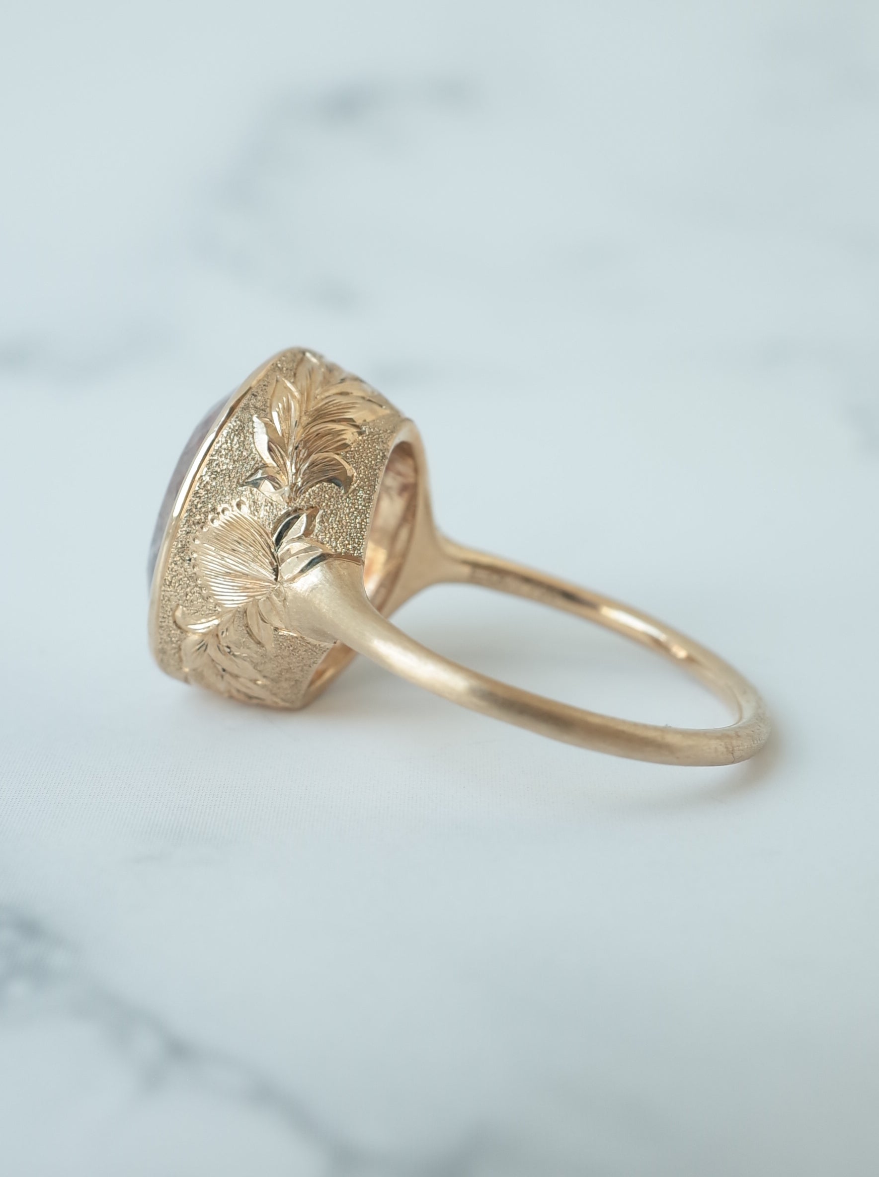 こちらはハワイアンエングレービングを施したデザインのリングで、彫り師、三村紀人さんとのコラボレーションコレクションです。ハワイの景色には欠かせない赤い花々を思わせるような真っ赤なレピドクロサイトインクォーツに、オヒアのモチーフとマイレリーフの模様が大胆に彫られています。