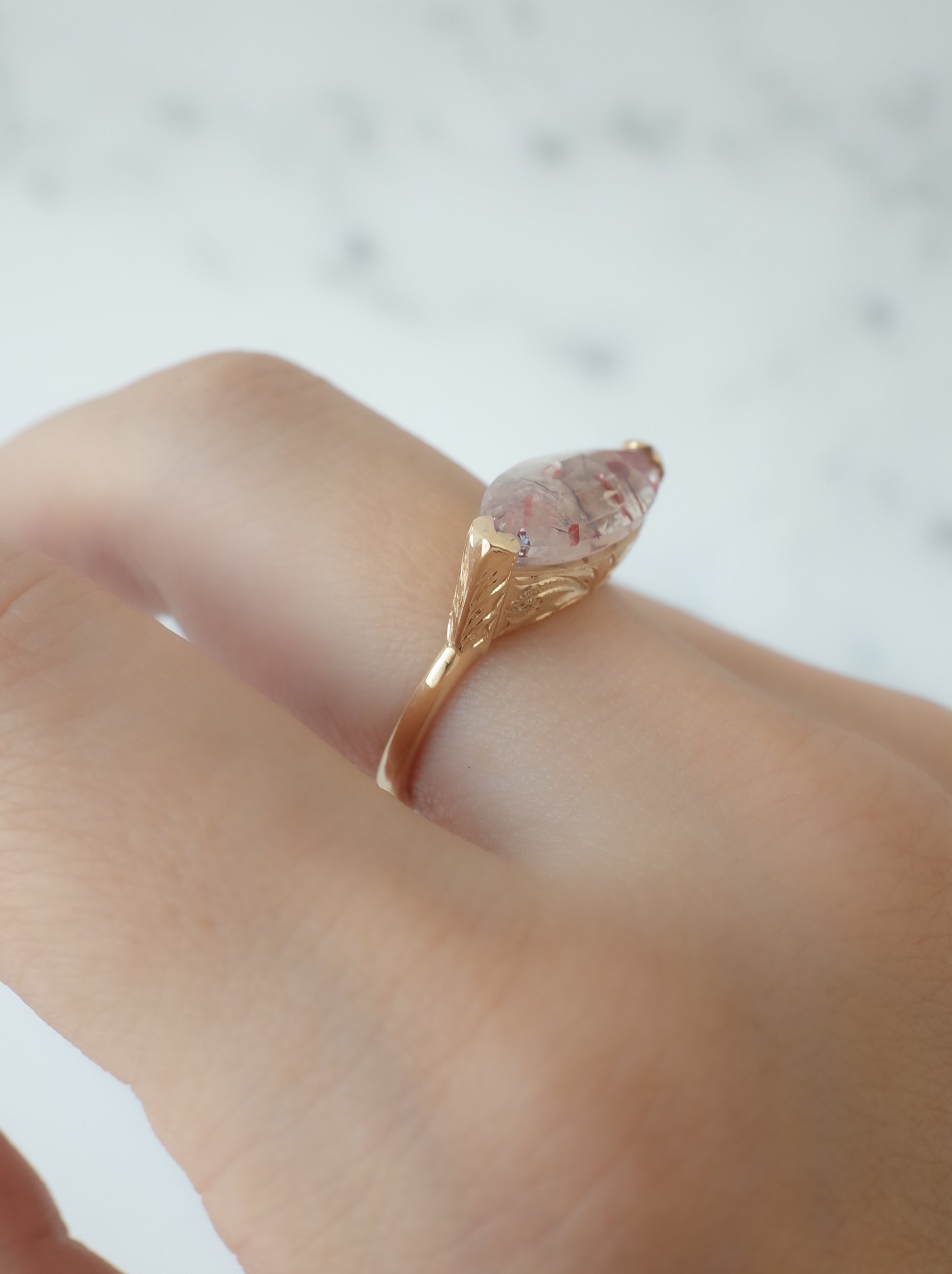 こちらはハワイアンエングレービングを施したデザインのリングで、彫り師、三村紀人さんとのコラボレーションコレクションです。ハワイの景色には欠かせない赤い花々を思わせるような真っ赤なレピドクロサイトインクォーツに、マイレリーフとスクロールの模様が大胆に彫られています。