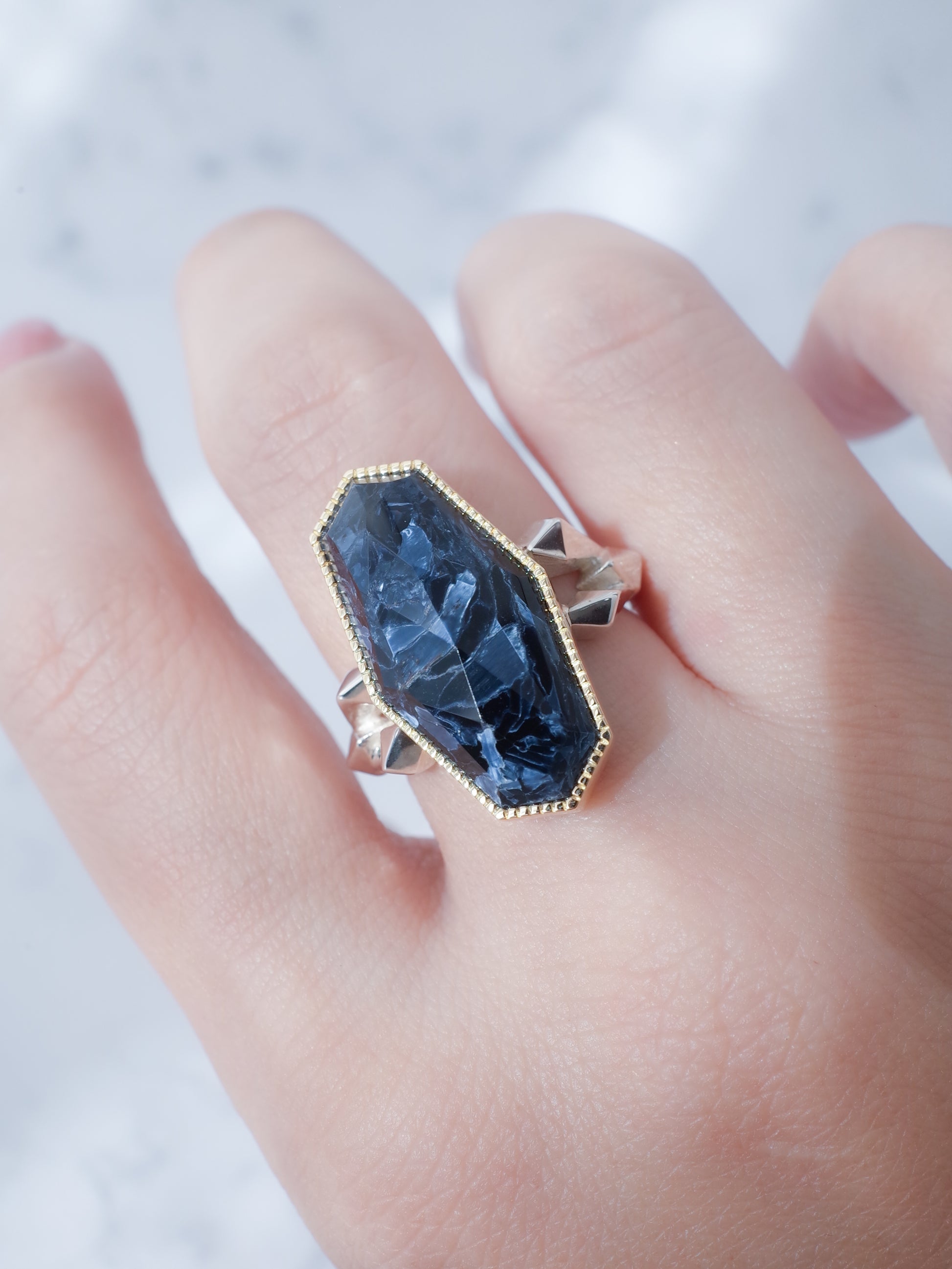 マーブルのような模様と深いネイビーカラーが美しいピーターサイト。カボションやマル玉が多く作られる天然石ですが、ファセットを施すことで見違えるほどモダンな印象に。地金はK18YG × Silver のコンビネーションを合わせ、クールなリングに仕上がりました。