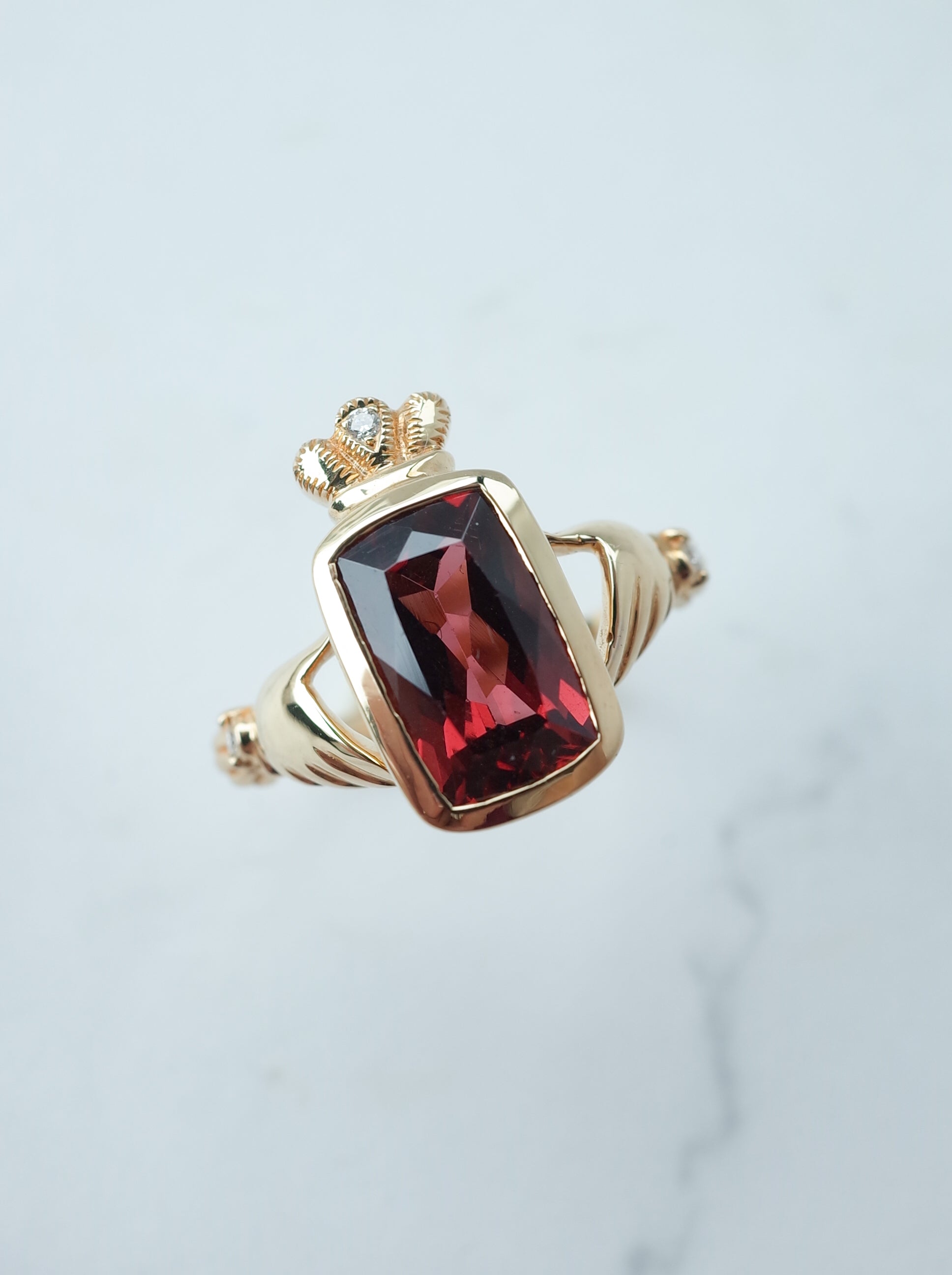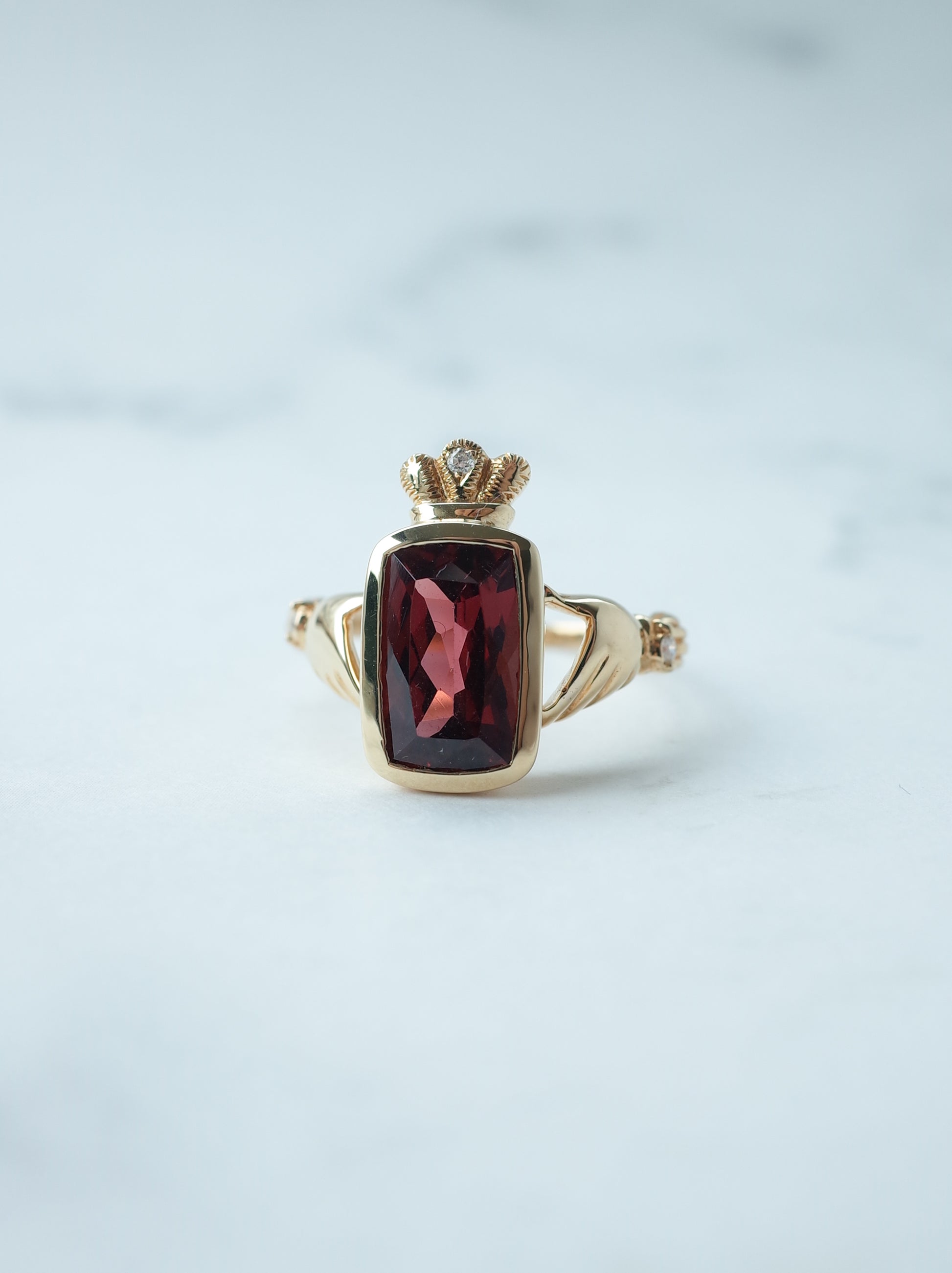 1月の誕生石ガーネット。そのイメージとして一番に頭に浮かぶこの赤色は、クラダリングの中心となる愛の象徴の色でもあります。シックに身につけていただけるように今回はあえてハートの形ではない赤色のガーネットを配しました。地金もより"ジュエリーらしい存在感"のある18金イエローゴールドに。是非大人のクラダをお楽しみください。