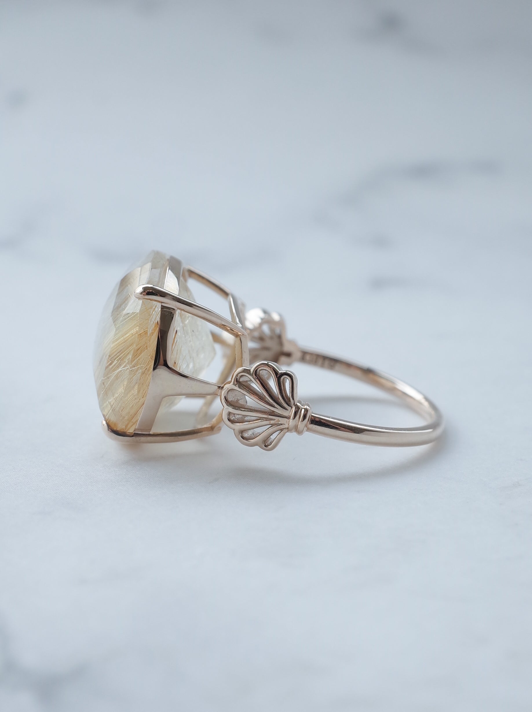 こちらはシェルモチーフを透かしてサイドにあしらったデザインです。いつも石をお預けした後はお任せで製作していただいてるカンナカットは、時折貝殻のような形状のルースが出来がります。シェルアームその雰囲気に合わせて作られました。