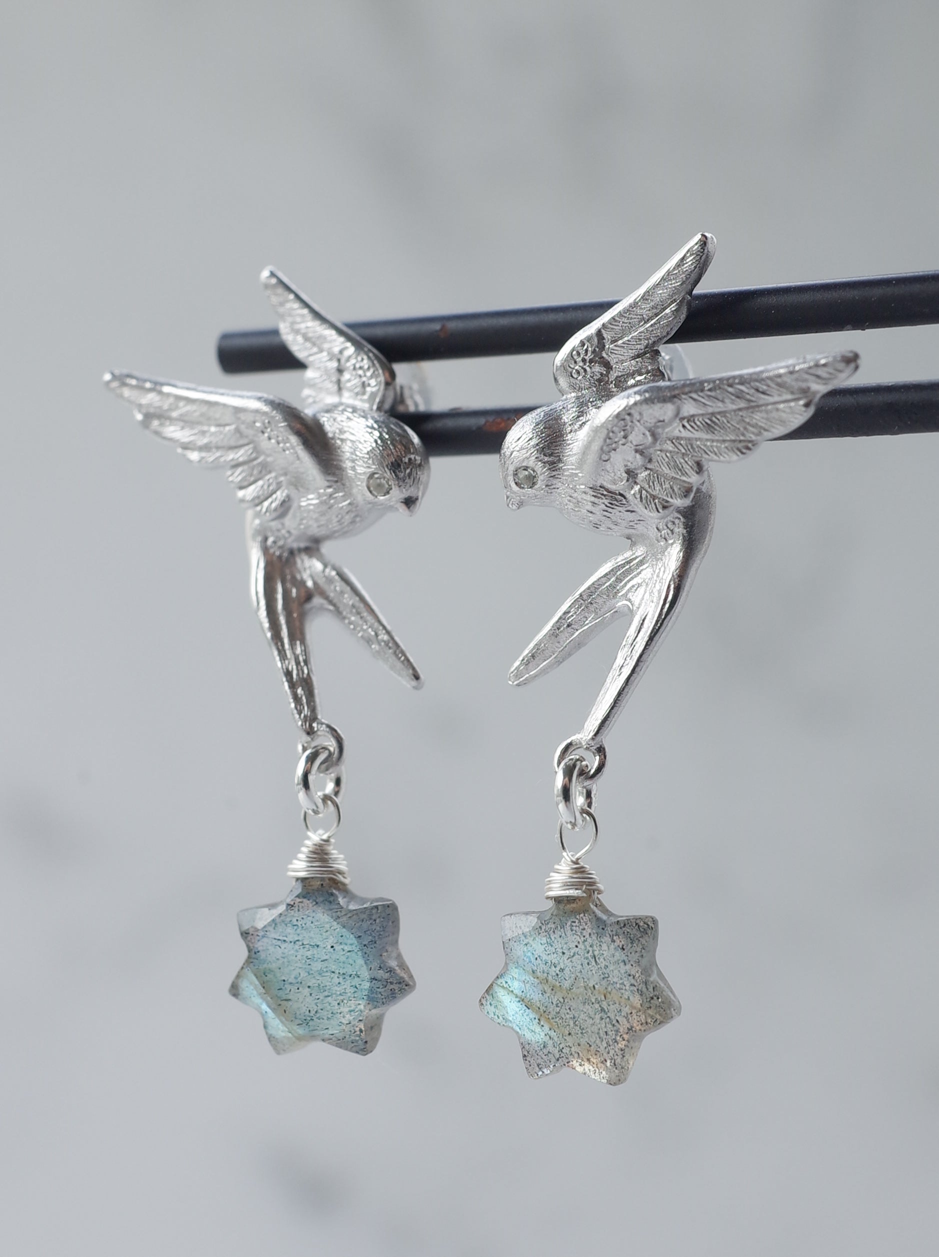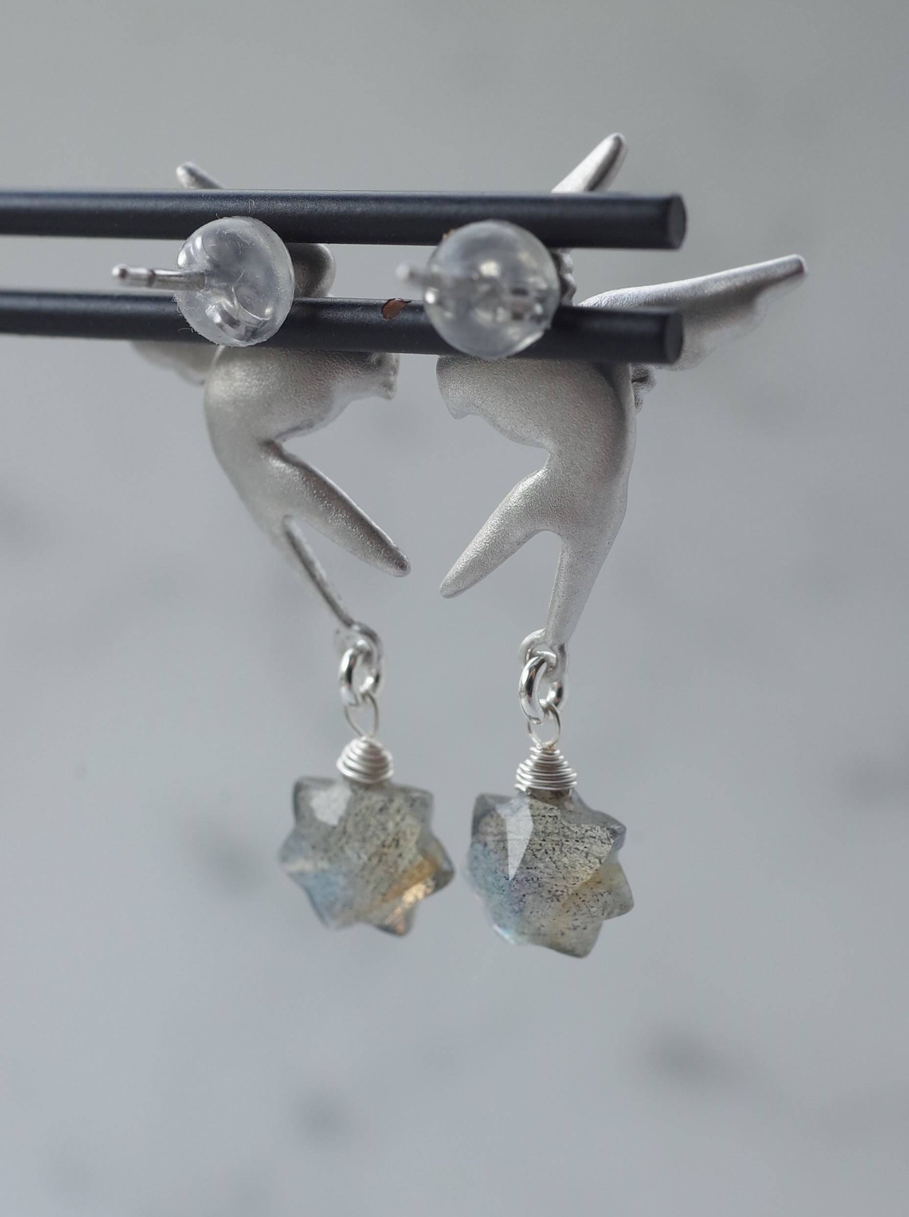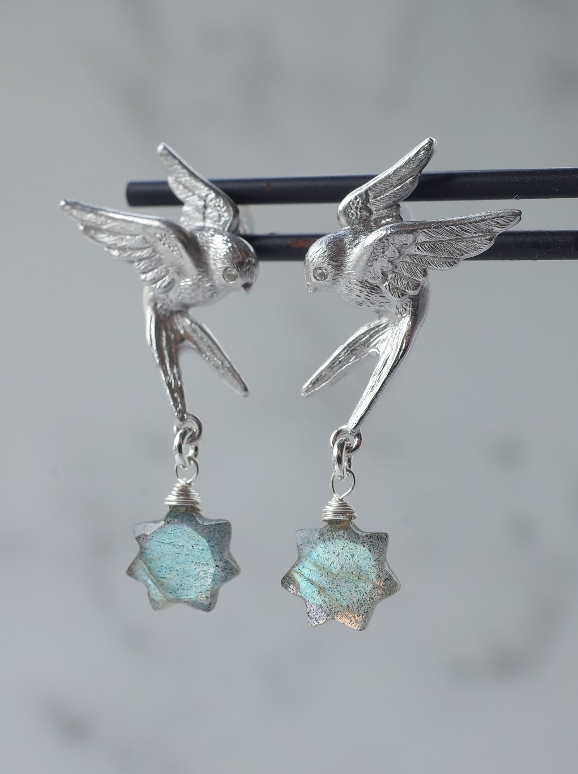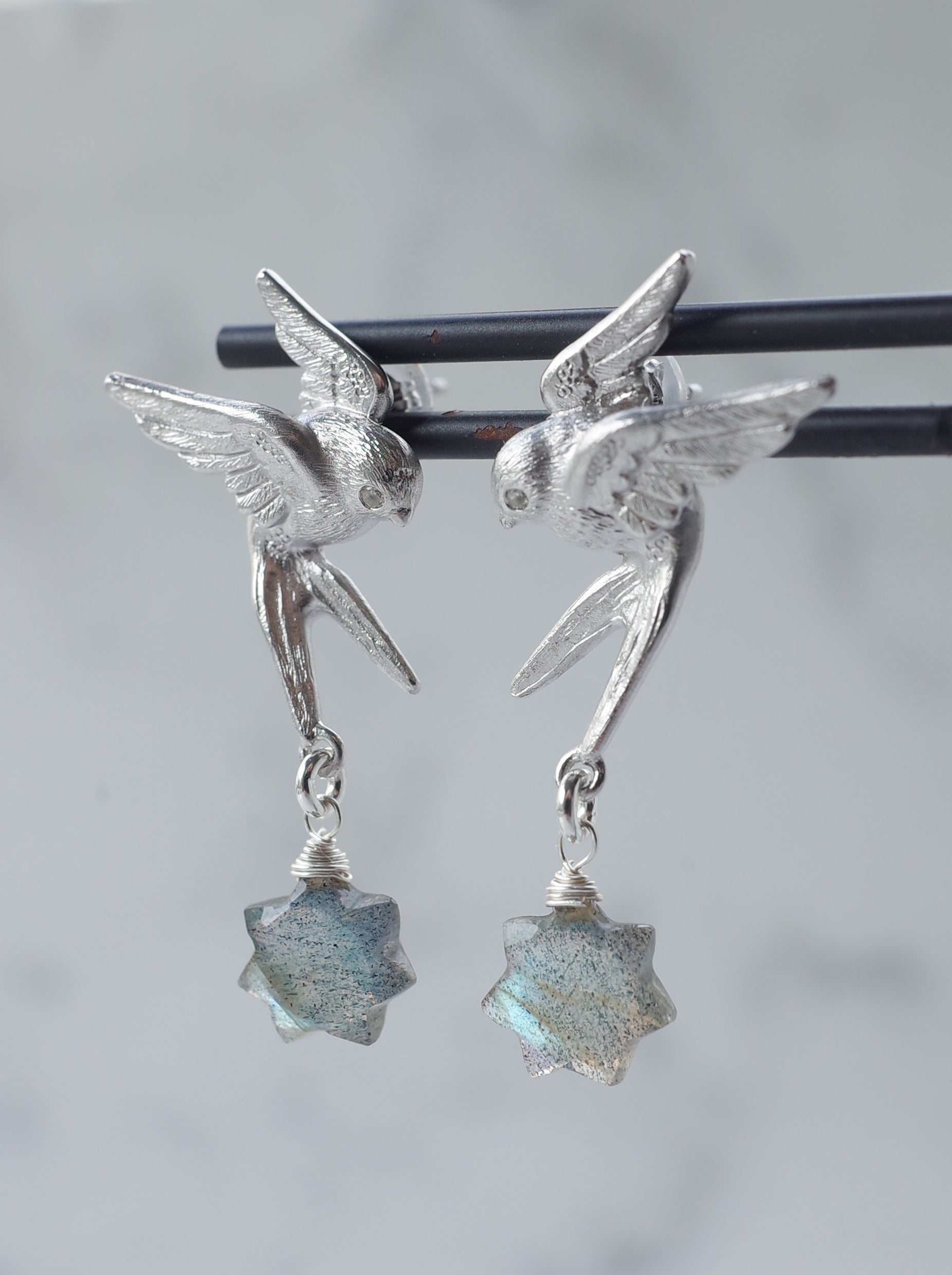 こちらは七芒星のラブラドライトをあしらったデザインです。モデル着用写真は石バージョンで撮影していますが、ツバメの形状は同じなので参考にされてください。