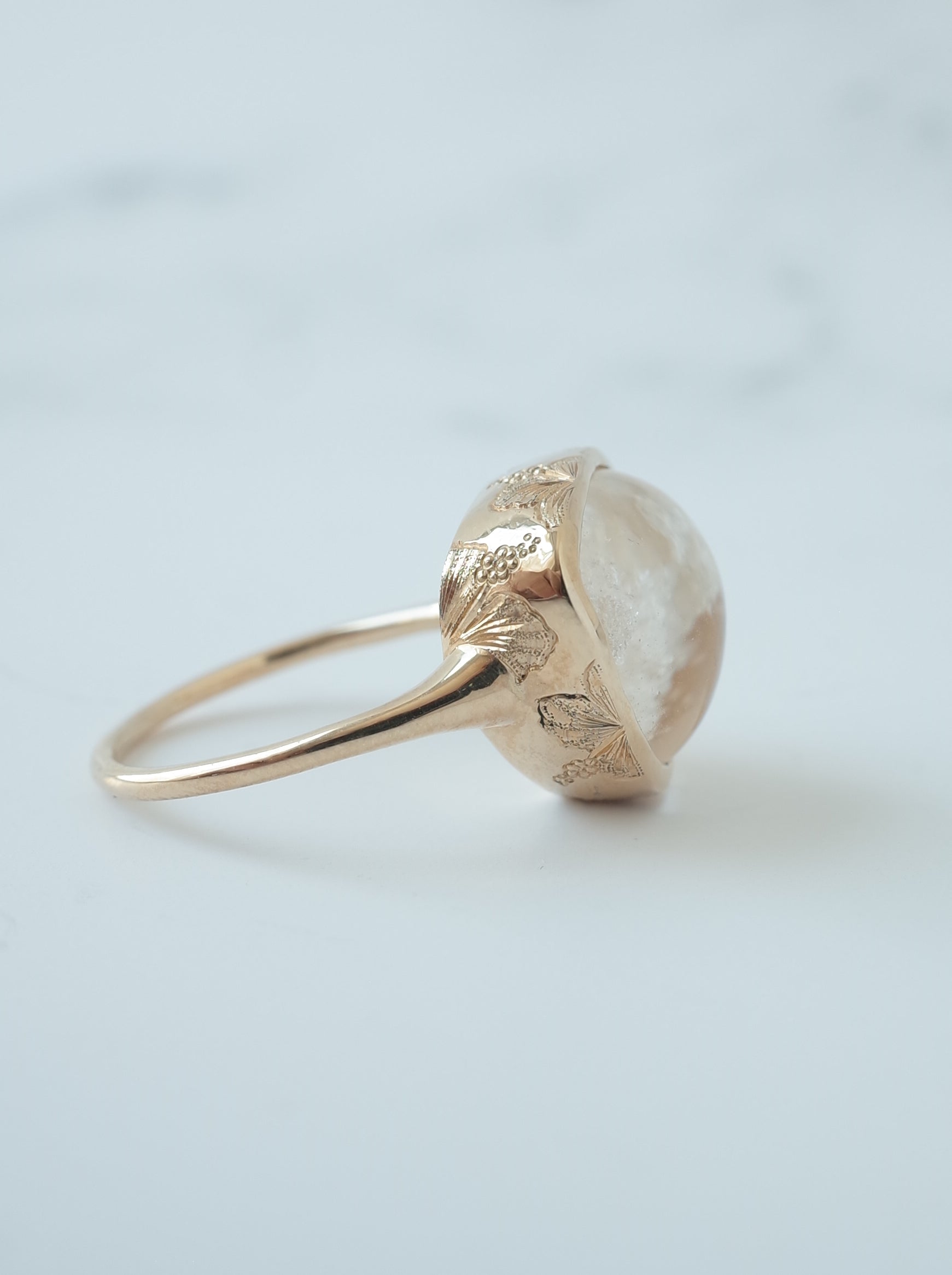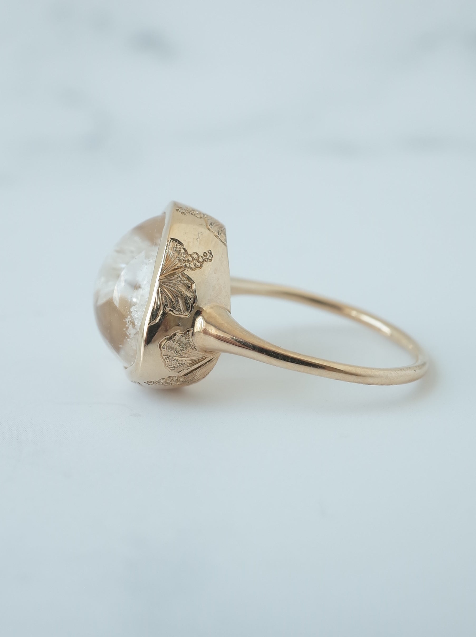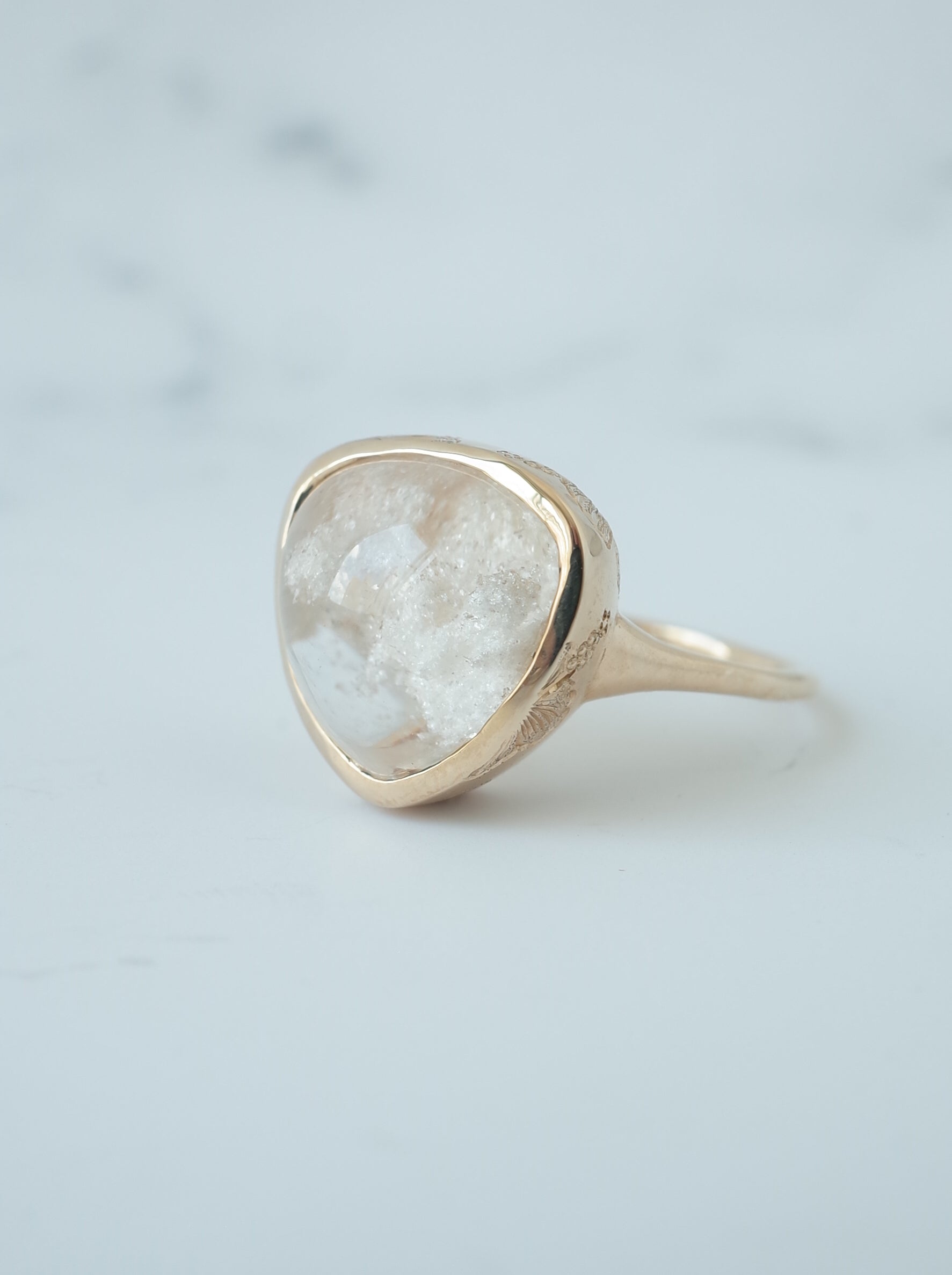 こちらはハワイアンエングレービングを施したデザインのリングで、彫り師、三村紀人さんとのコラボレーションコレクションです。ころんと可愛らしいとトリリアントシェイプのホワイトガーデンクォーツに、写実的なハイビスカスの花の模様が大胆に彫られています。