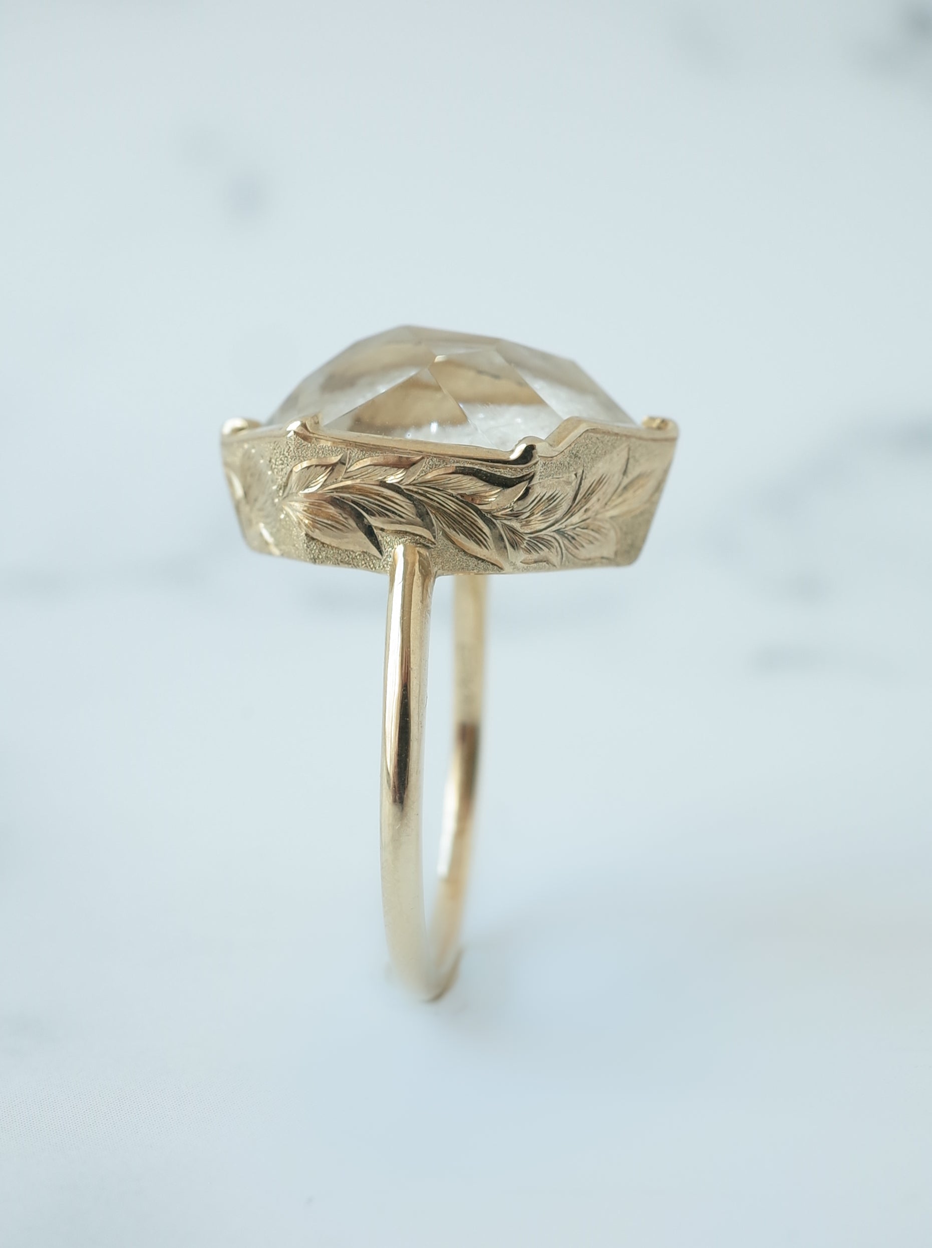こちらはハワイアンエングレービングを施したデザインのリングで、彫り師、三村紀人さんとのコラボレーションコレクションです。ファセットカットのホワイトガーデンクォーツの形状に合わせて石座が作られており、エッジの山形のラインに沿って模様が彫られた、まさに一点もののリングです。